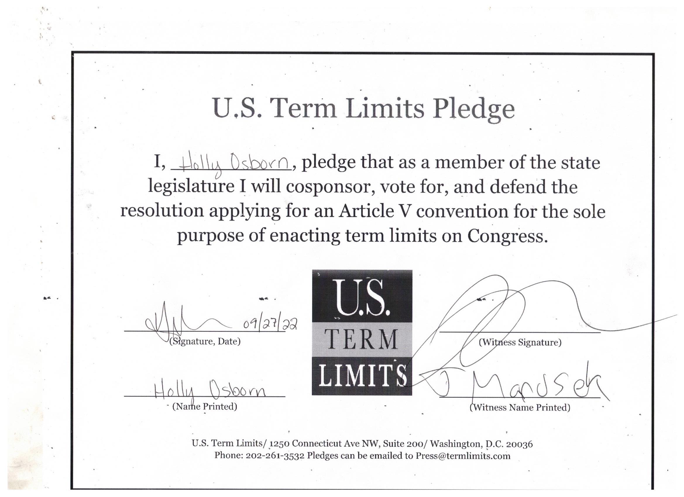 USTL President, Philip Blumel, commented on Osborn’s pledge saying, “Holly’s support of term limits shows that there are individuals who are willing to listen to the majority of voters who want term limits. America needs a Congress that will be served by citizen legislators, not career politicians.”