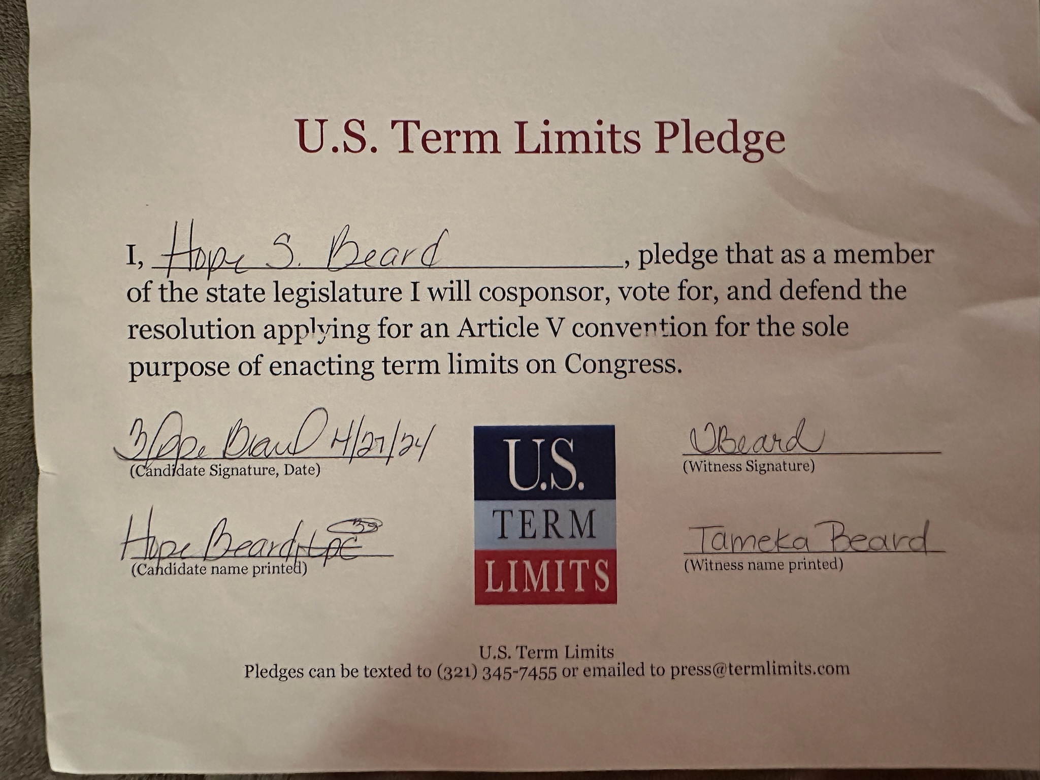 Hope Beard Pledges to Support Congressional Term Limits