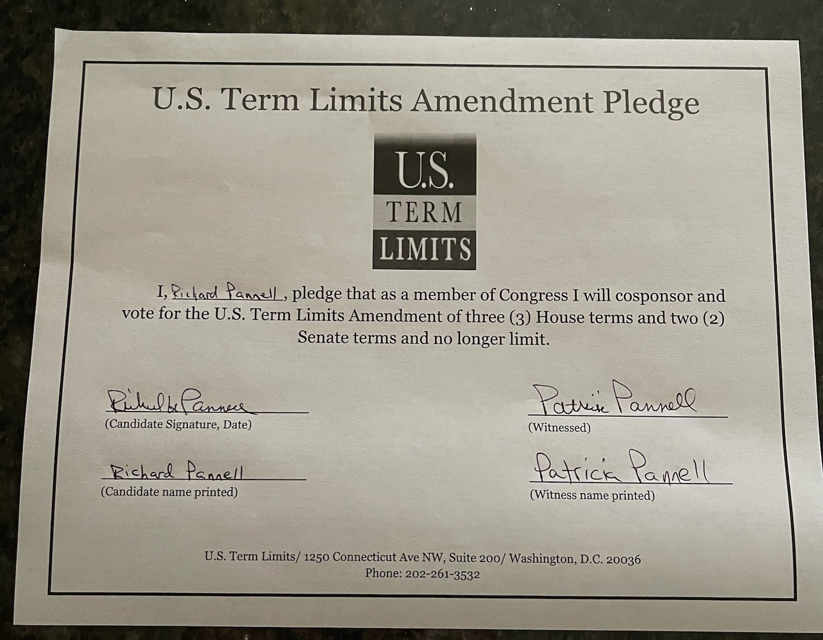 The U.S. Term Limits amendment pledge is provided to every announced candidate for federal office. It reads, “I pledge that as a member of Congress, I will cosponsor and vote for the U.S. Term Limits amendment of three (3) House terms and two (2) Senate terms and no longer limit.” The U.S. Term Limits constitutional amendment has been introduced in both the U.S. Senate by Senator Ted Cruz and his colleagues (SJR3) and the U.S. House by Representative Ralph Norman (HJR12).
