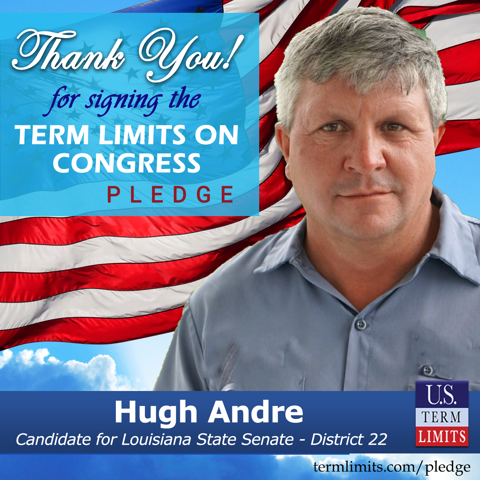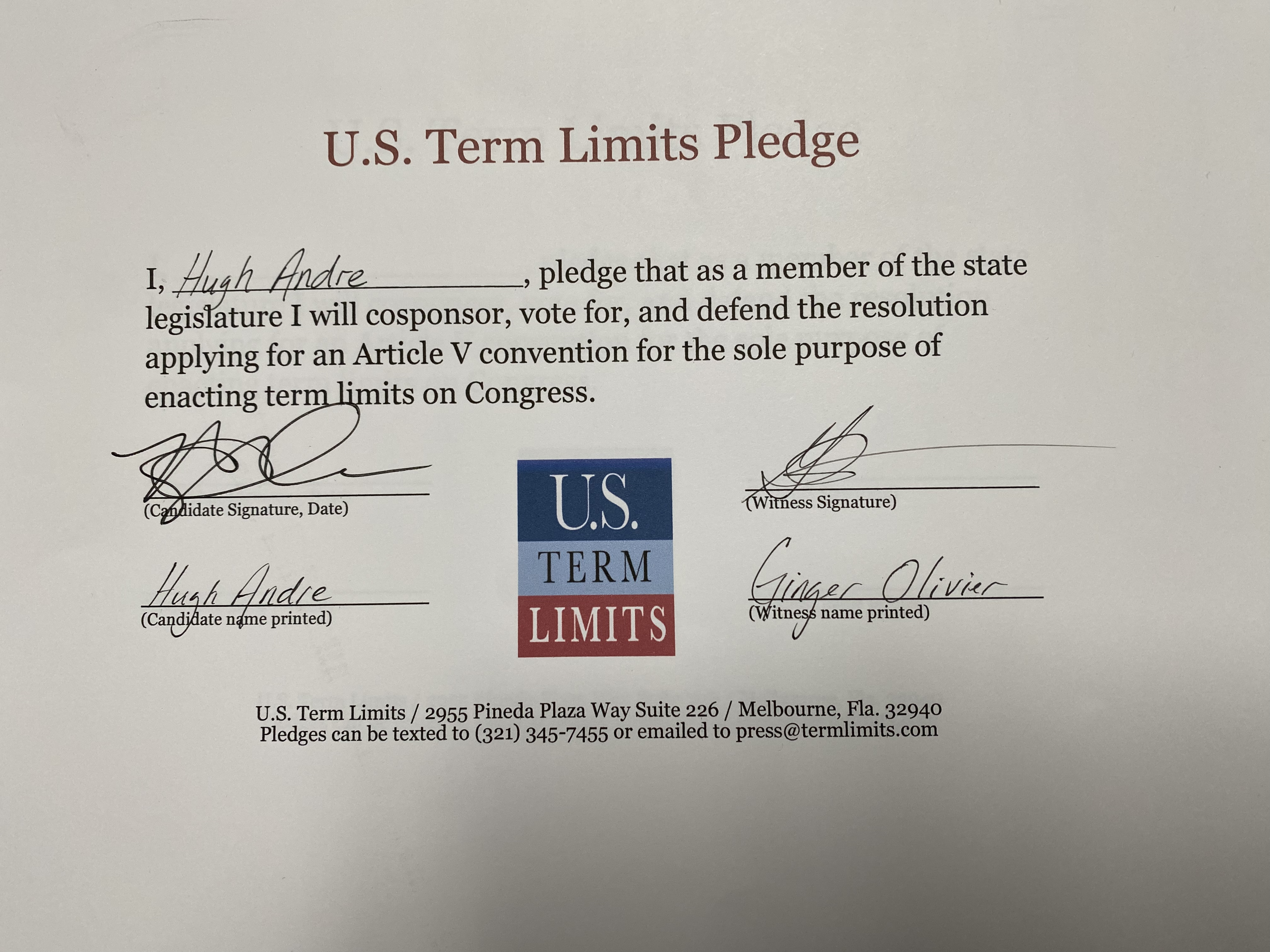 USTL President, Philip Blumel, commented on Andre’s pledge saying, “Hugh’s support of term limits shows that there are individuals who are willing to listen to the majority of voters who want term limits. America needs a Congress that will be served by citizen legislators, not career politicians.”