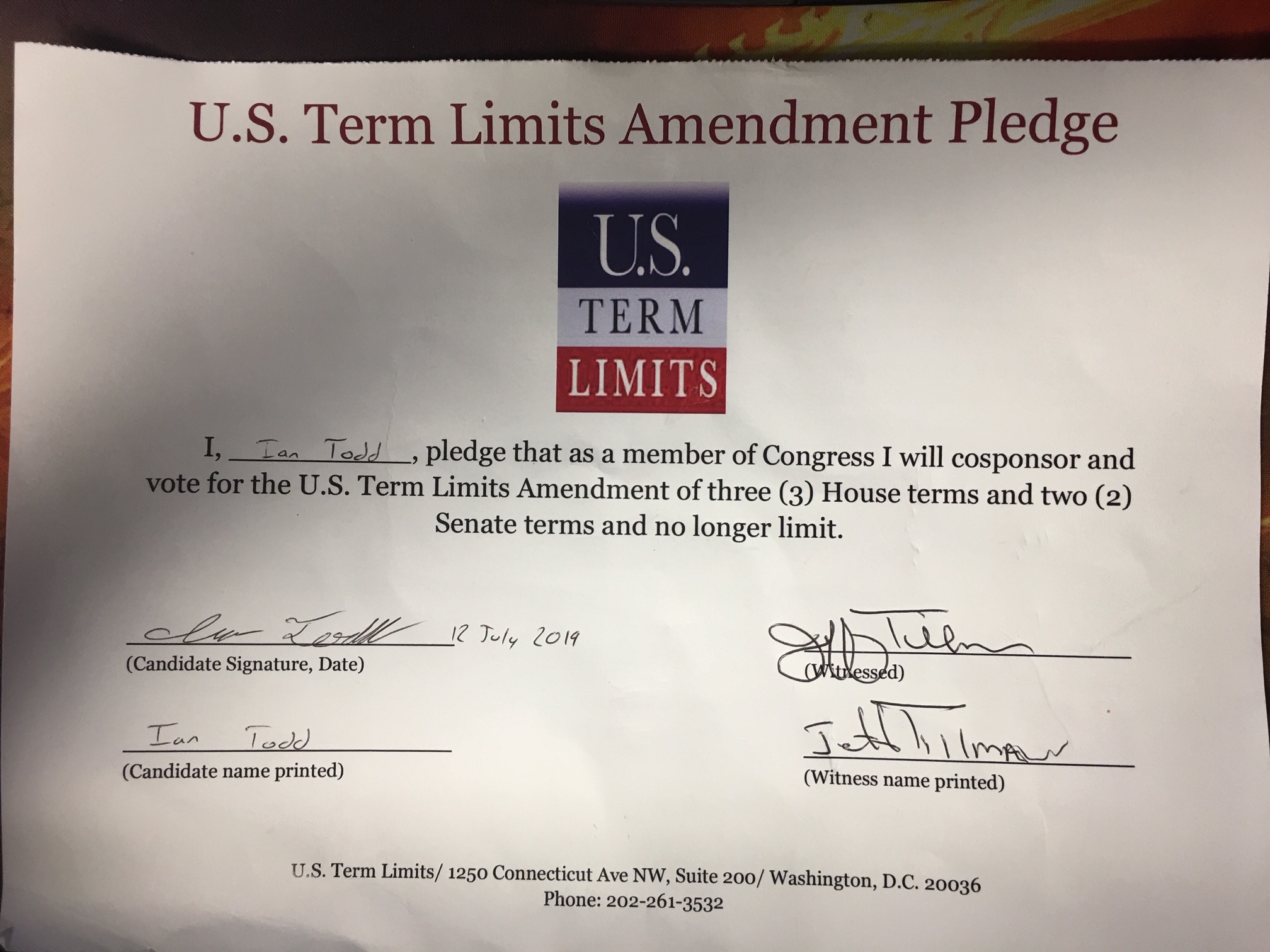 Washington, D.C. – U.S. Term Limits (USTL), the leader in the non-partisan national movement to limit terms for elected officials, praises Ian Todd, 2020 U.S. House candidate from Minnesota’s 6th congressional district, for signing the pledge for an amendment to term limit Congress.