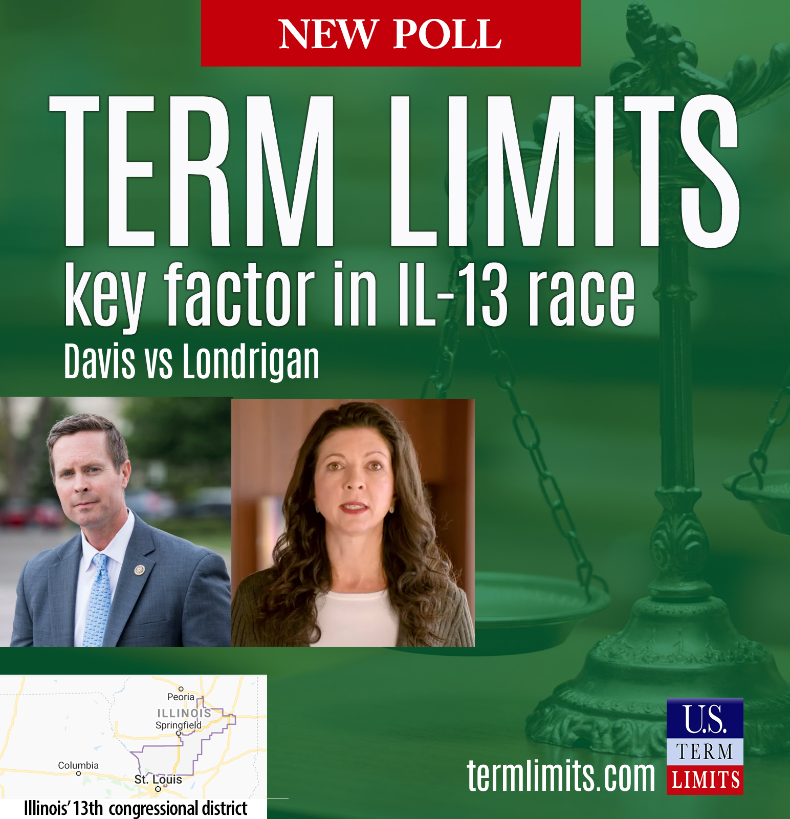 This gap in awareness presents a great opportunity to Londrigan to widen her lead. When voters in the 13th district, 77% of whom support term limits, learn of Davis’ opposition – they flock to Londrigan in droves. Assuming Londrigan herself also supports congressional term limits. If Londrigan does not emphasize term limits, the race remains a tossup.