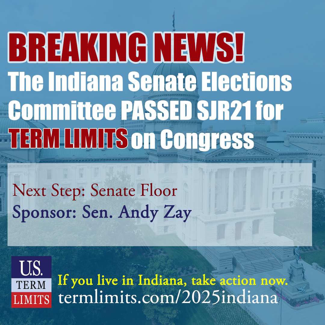 SJR21 has bipartisan sponsorship and the support of more than sixty legislators who have signed the term limits pledge, promising to support the congressional term limits effort. The next step will be a vote on the senate floor. Once the measure passes in both chambers, Indiana will be in the forefront of the states in the nation to file an application for a convention with the exclusive purpose of proposing term limits on the U.S. Congress.