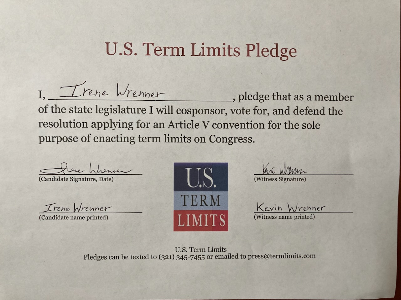 Irene Wrenner Pledges to Support Congressional Term Limits