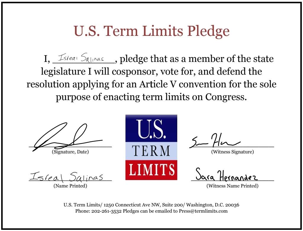 Austin, TX – U.S. Term Limits (USTL), the leader in the national, non-partisan movement to limit terms for elected officials, is gathering support from state lawmakers across the nation. Its mission is to get 34 states to apply for an amendment proposal convention specific to term limits on Congress. Texas state senate candidate, Isreal Salinas (district 27) has committed support for term limits on Congress by signing the Term Limits Convention pledge. Previously, candidates Raul Torres, Alex Dominguez and Sara Stapleton-Barrera also signed the pledge.