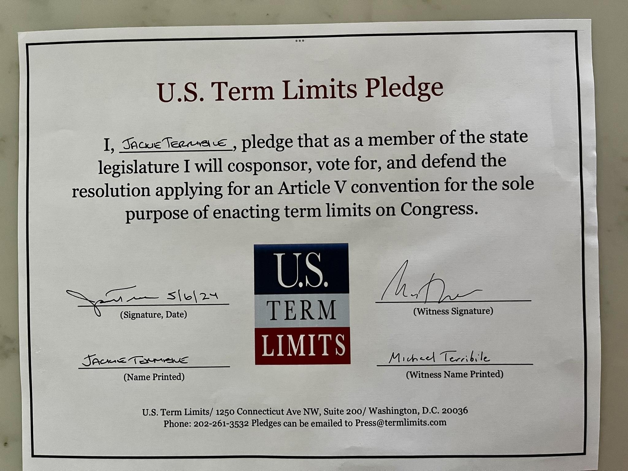 Jackie Terribile Pledges to Support Congressional Term Limits
