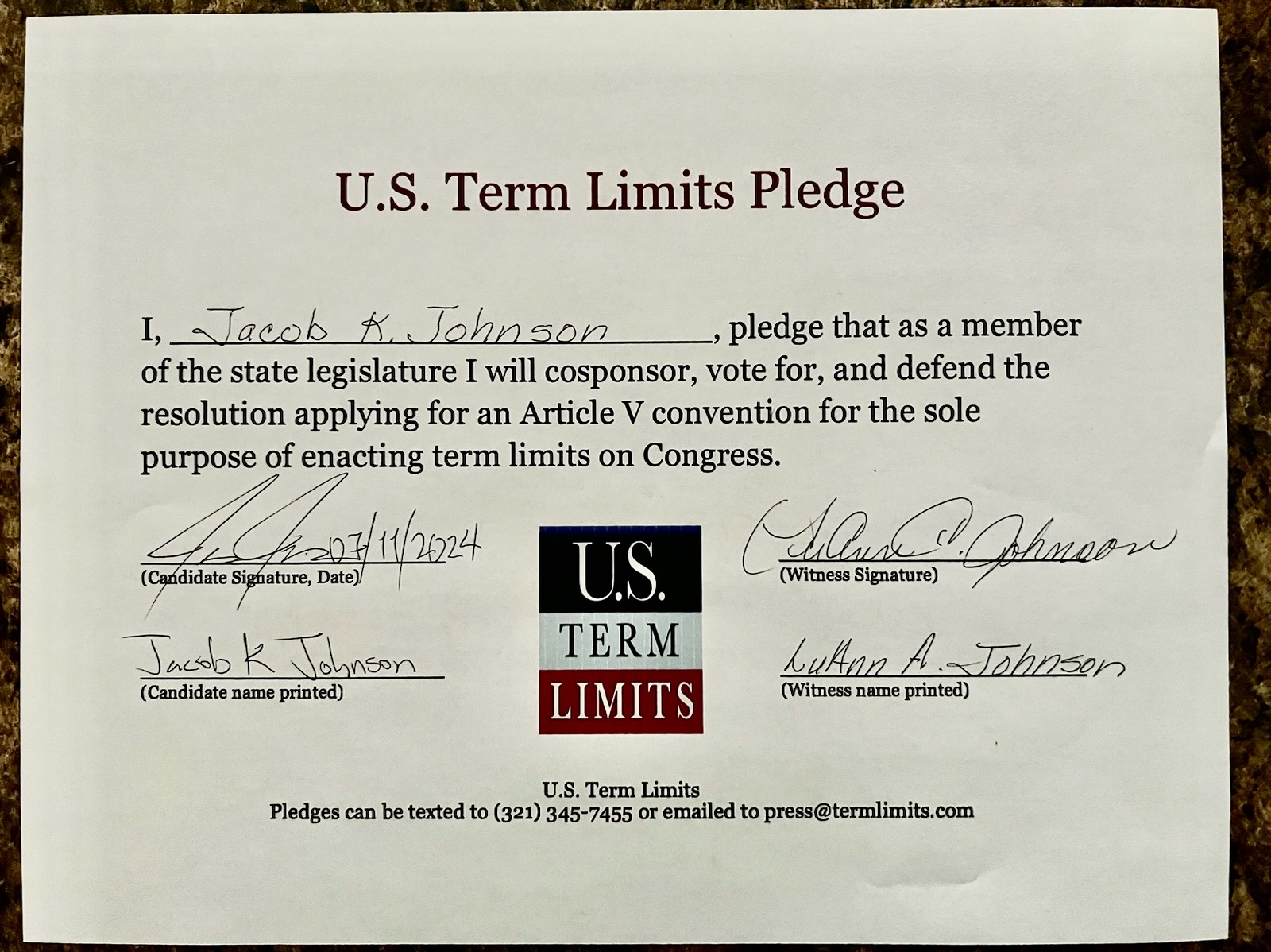 Jacob Johnson Pledges to Support Congressional Term Limits