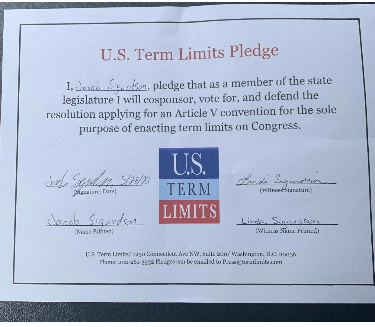 Jacob Sigurdson Pledges to Support Congressional Term Limits