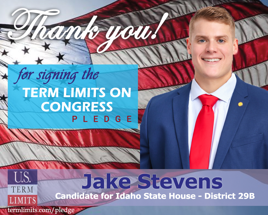 Boise, ID – U.S. Term Limits (USTL), the leader in the national, non-partisan movement to limit terms for elected officials, is gathering support from state lawmakers across the nation. Its mission is to get 34 states to apply for an amendment proposal convention specific to term limits on Congress. Idaho state house candidate, Jake Stevens (district 29B), has committed support for term limits on Congress by signing the U.S. Term Limits pledge. Previously, Craig Yadon also signed the pledge.