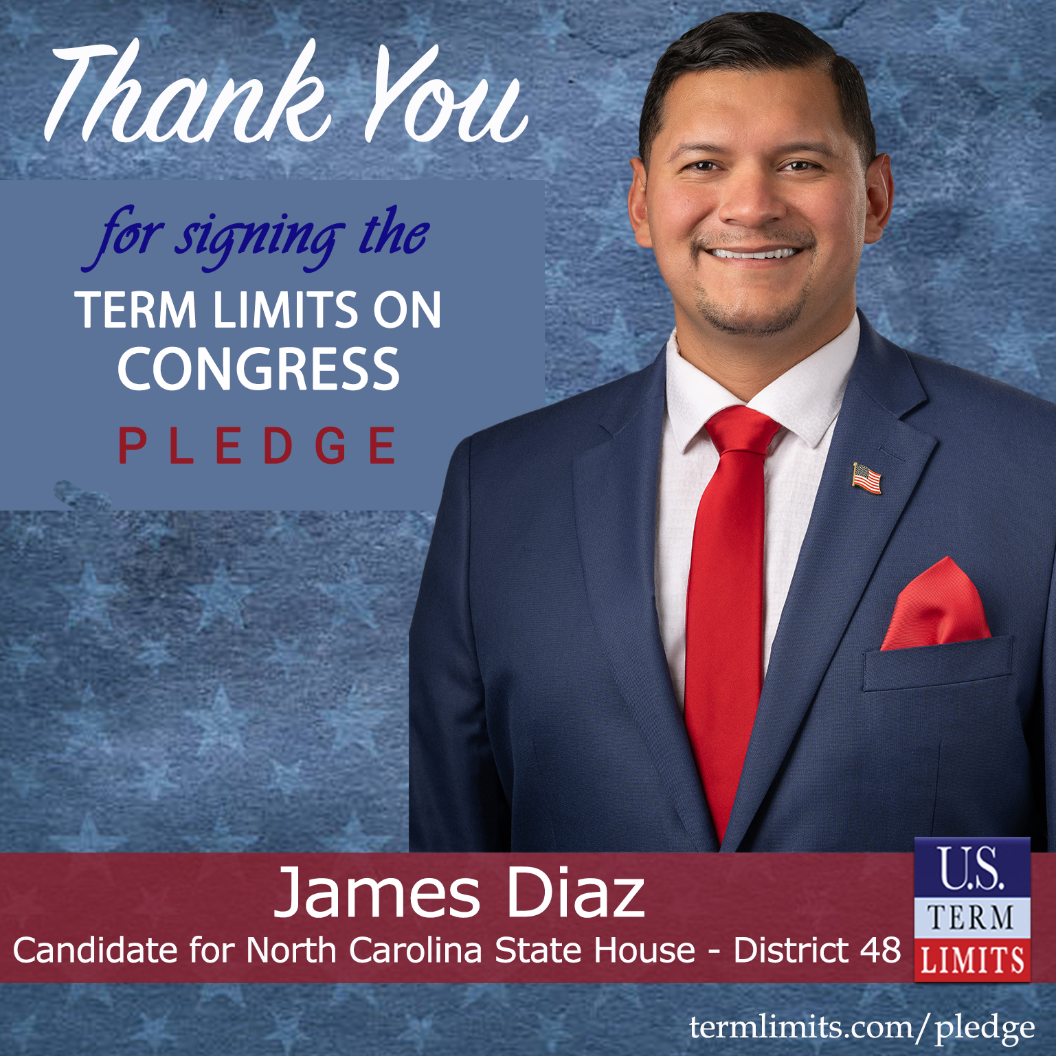 Raleigh, NC – U.S. Term Limits (USTL), the leader in the national, non-partisan movement to limit terms for elected officials, is gathering support from state lawmakers across the nation. Its mission is to get 34 states to apply for an amendment proposal convention specific to term limits on Congress. North Carolina state house candidate, James Diaz (District 48), has committed support for term limits on Congress by signing the term limits convention pledge. Previously, candidate Ralph Carter also signed the pledge.