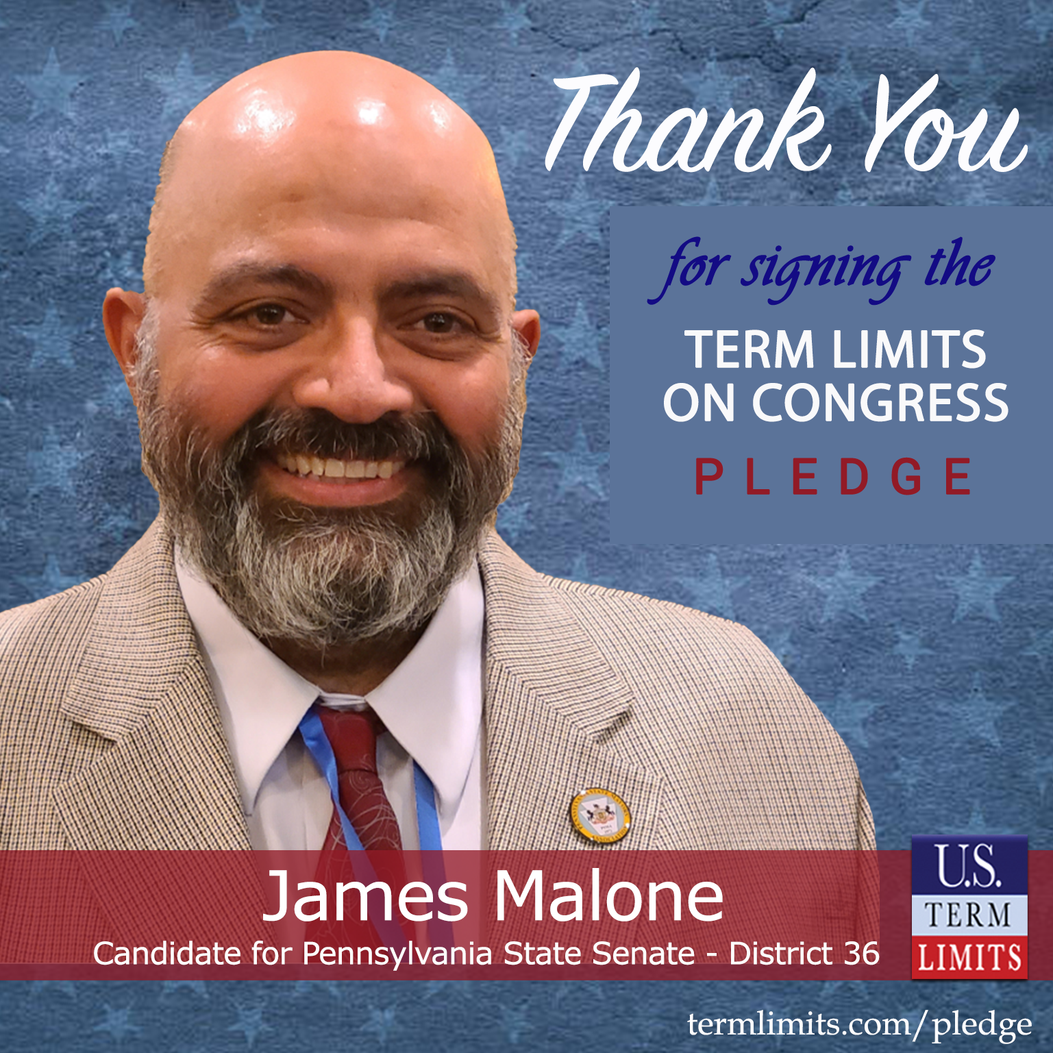 Lititz, PA – U.S. Term Limits (USTL), the leader in the national, non-partisan movement to limit terms for elected officials, is gathering support from state lawmakers across the nation. Its mission is to get 34 states to apply for an amendment proposal convention specific to term limits on Congress. 2025 Pennsylvania state senate candidate, James Malone (district 36), has committed support for term limits on Congress by signing the term limits convention pledge. The special election is scheduled for March 25, 2025.