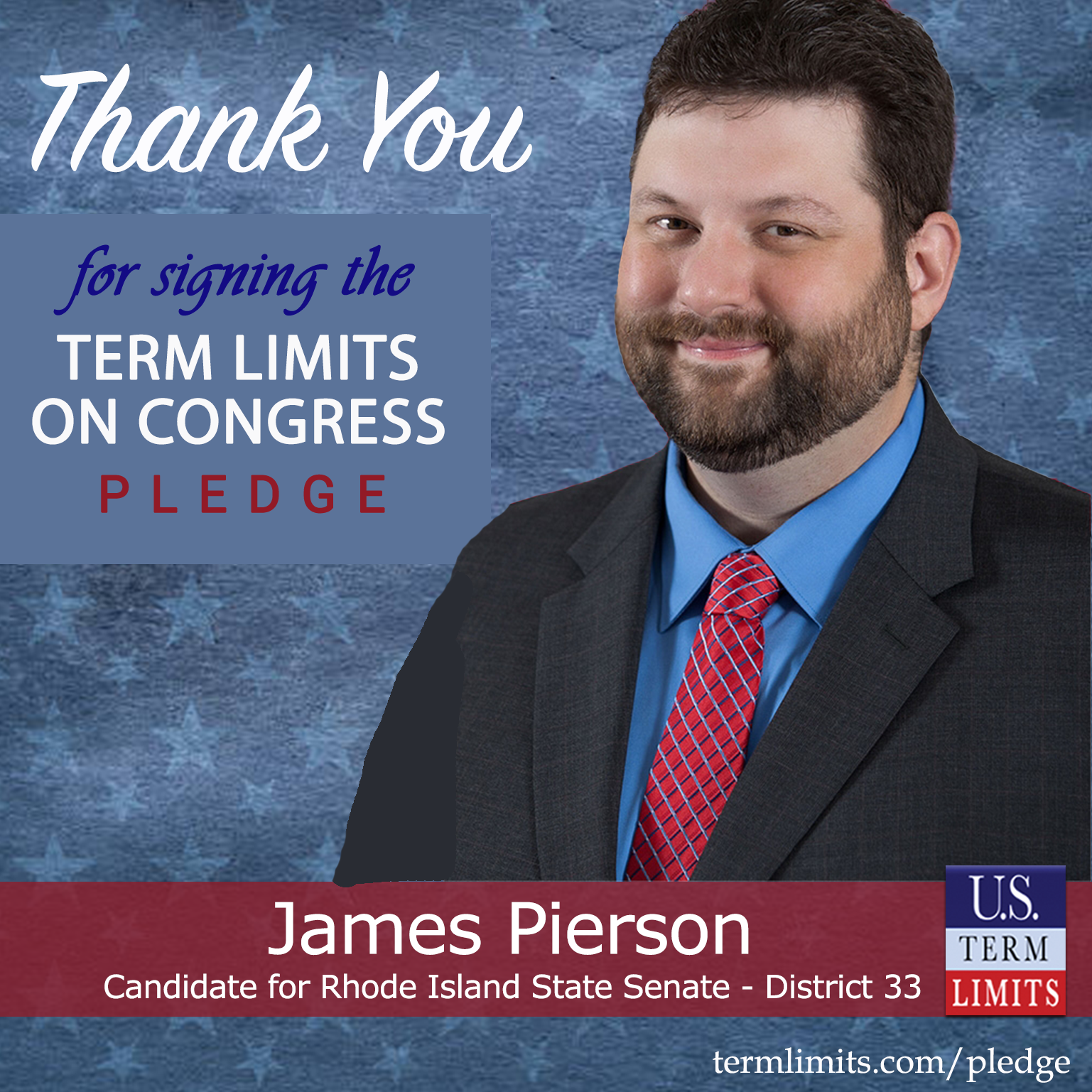 West Warwick, RI – U.S. Term Limits (USTL), the leader in the national, non-partisan movement to limit terms for elected officials, is gathering support from state lawmakers across the nation. Its mission is to get 34 states to apply for an amendment proposal convention specific to term limits on Congress. Rhode Island state senate candidate, James Pierson (District 33), has committed support for term limits on Congress by signing the term limits convention pledge.