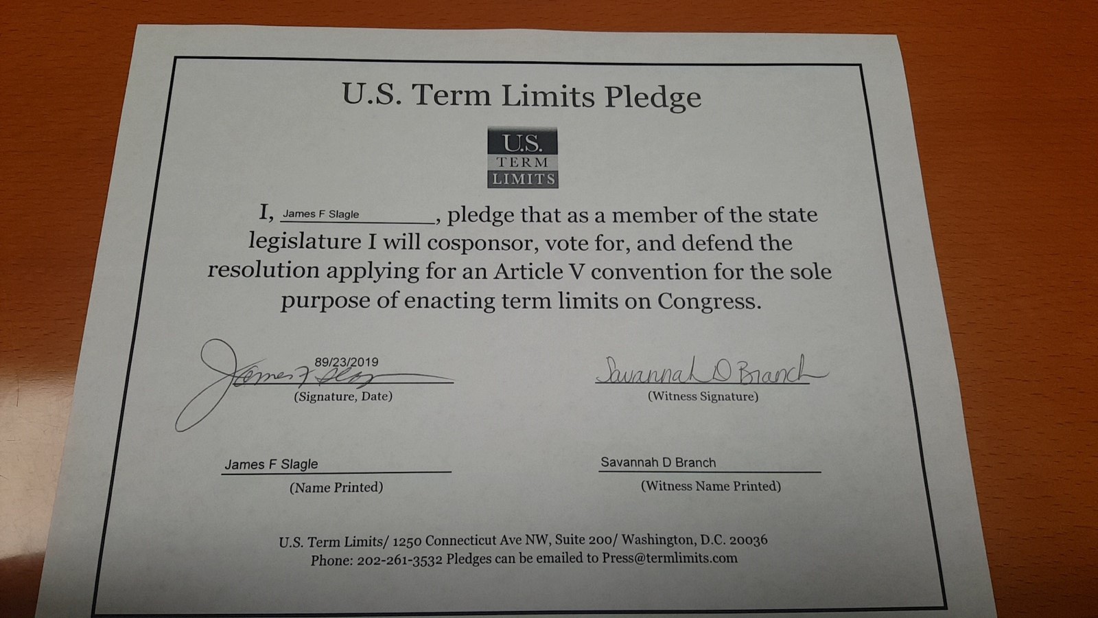 USTL President, Philip Blumel, commented on the pledge saying, “Slagle’s support of term limits shows that there are individuals who are willing to listen to the majority of voters who want term limits. America needs a Congress that will be served by citizen legislators, not career politicians.”