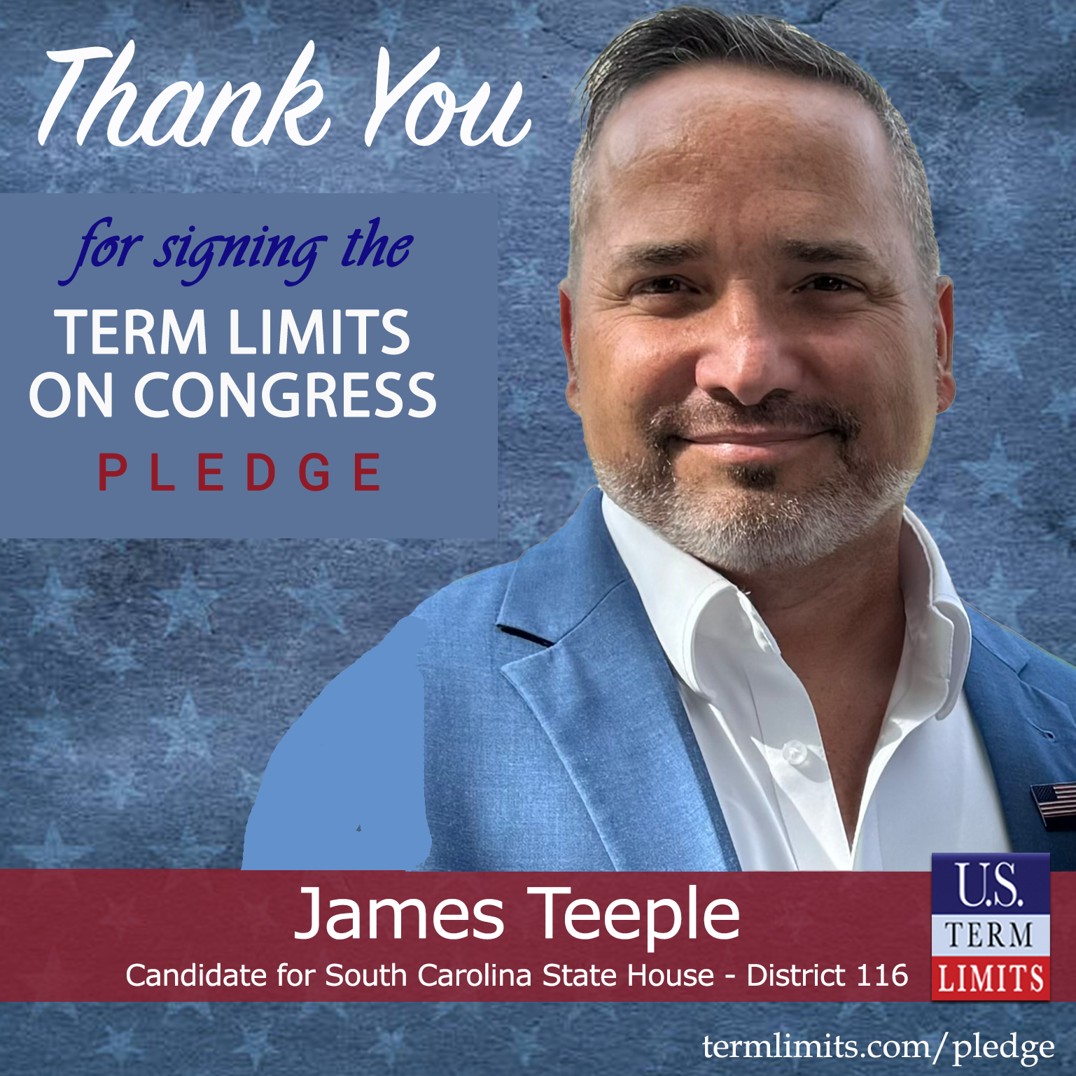 “Term limits are important for the future of our nation. I am glad that James is willing to sign the candidate pledge and recognizes the positive impact term limits will have on our country”, says John Warren, state chair for U.S. Term Limits.
