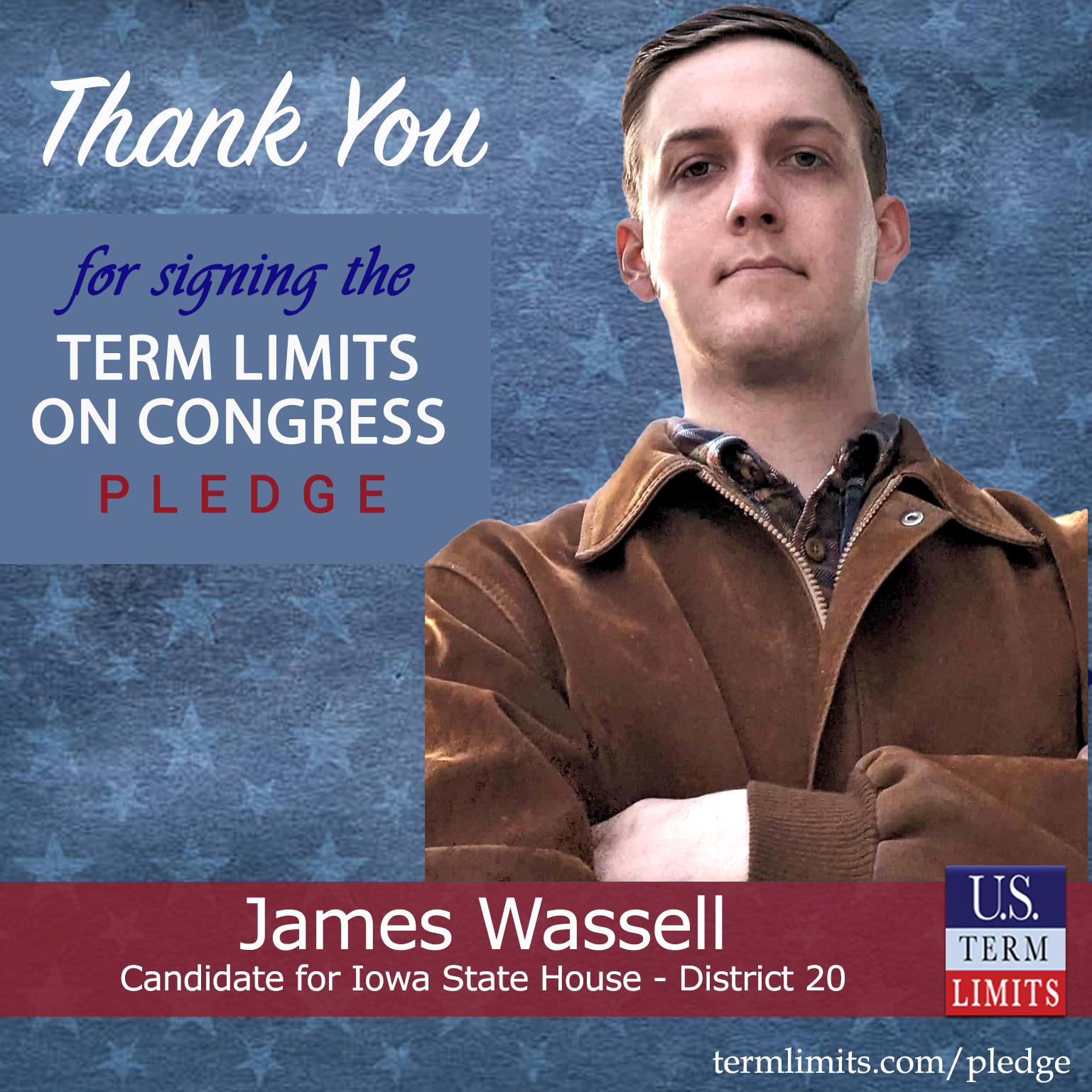 Council Bluffs, IA – U.S. Term Limits (USTL), the leader in the national, non-partisan movement to limit terms for elected officials, is gathering support from state lawmakers across the nation. Its mission is to get 34 states to apply for an amendment proposal convention specific to term limits on Congress. Iowa state house candidate, James Wassell (district 20), has committed support for term limits on Congress by signing the term limits convention pledge.