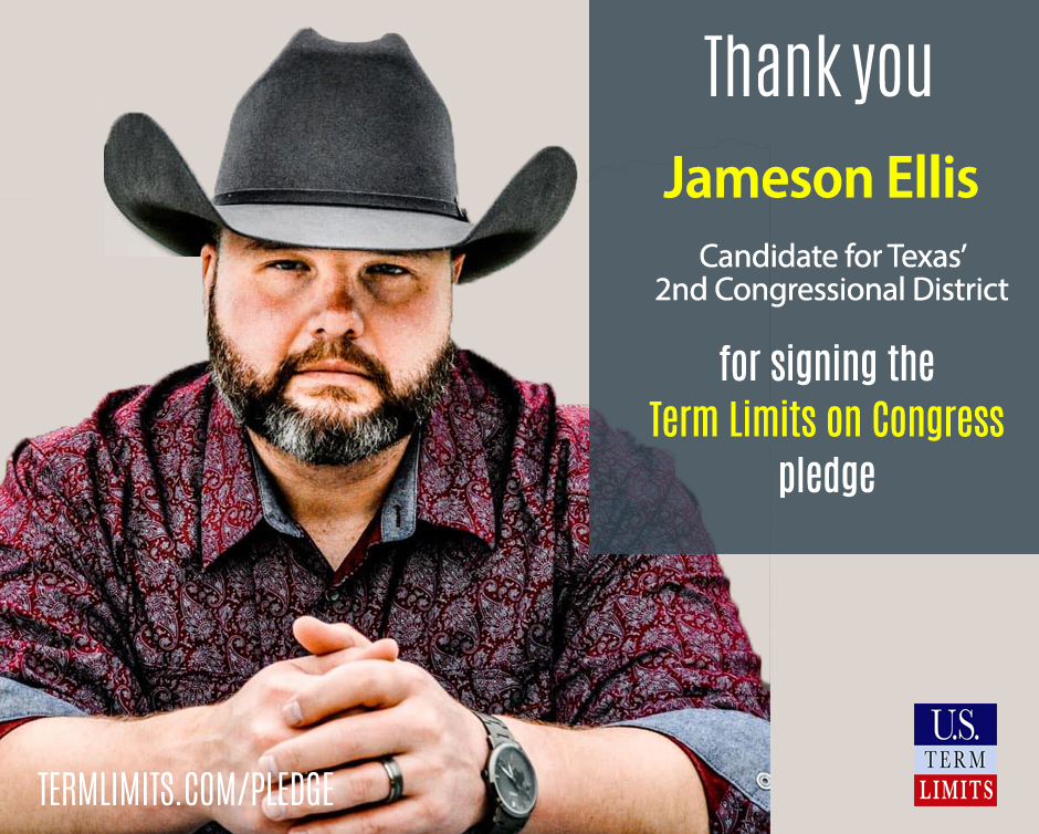 Washington D.C. – U.S. Term Limits (USTL), the leader in the non-partisan national movement to limit terms for elected officials, praises 2022 U.S. house candidate for Texas, Jameson Ellis (district 2), for signing the pledge for an amendment to term limit Congress. Previously, candidate Martin Etwop also signed the pledge.