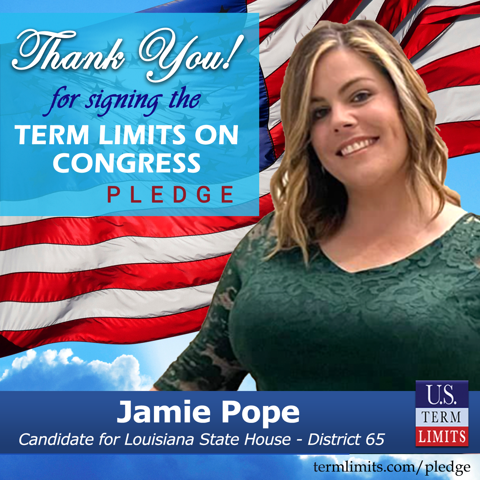 Baton Rouge, LA – U.S. Term Limits (USTL), the leader in the national, non-partisan movement to limit terms for elected officials, is gathering support from state lawmakers across the nation. Its mission is to get 34 states to apply for an amendment proposal convention specific to term limits on Congress. Louisiana state house candidate, Jamie Pope (District 65), has committed support for term limits on Congress by signing the Term Limits Convention pledge. Previously, candidates Brandon Ivey and Lauren Ventrella also signed the pledge in this race.