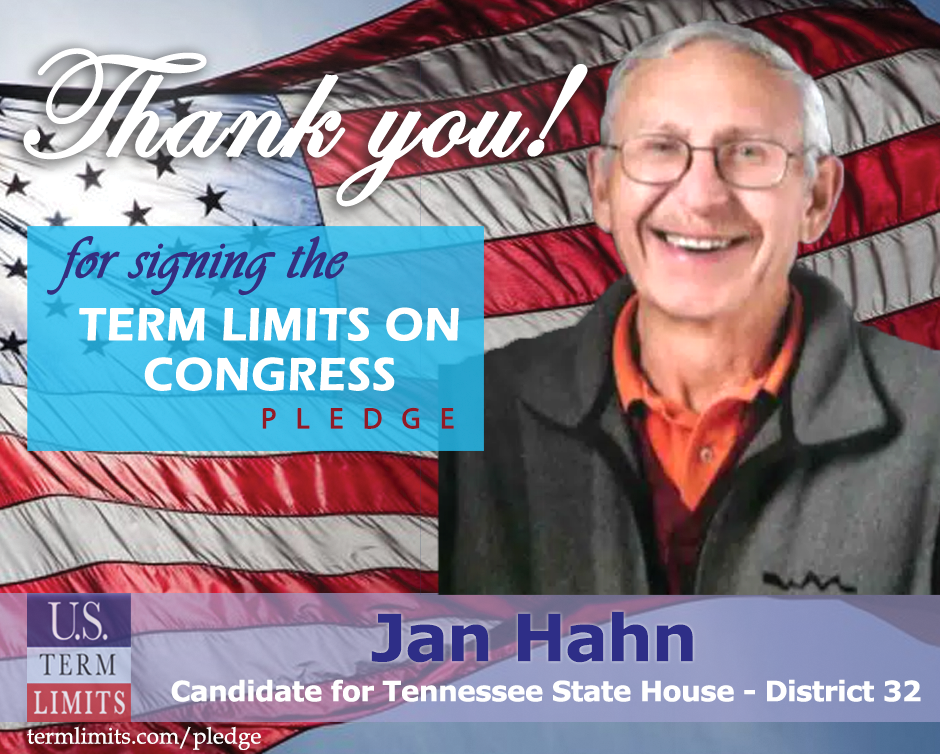 Kingston, TN – U.S. Term Limits (USTL), the leader in the national, non-partisan movement to limit terms for elected officials, is gathering support from state lawmakers across the nation. Its mission is to get 34 states to apply for an amendment proposal convention specific to term limits on Congress. Tennessee state house candidate, Jan Hahn (district 32), has committed support for term limits on Congress by signing the U.S. Term Limits pledge.