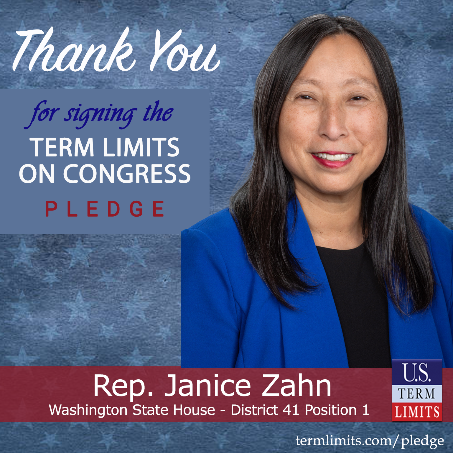Olympia, WA – U.S. Term Limits (USTL), the leader in the national, non-partisan movement to limit terms for elected officials, is gathering support from state lawmakers across the nation. Its mission is to get 34 states to apply for an amendment proposal convention specific to term limits on Congress. 2025 Washington state house Rep. Janice Zahn (district 41-position 1), has committed support for term limits on Congress by signing the term limits convention pledge. Previously, candidates John Whitney and Vinita Kak also signed the pledge. The primary special election is scheduled for August 5, 2025.