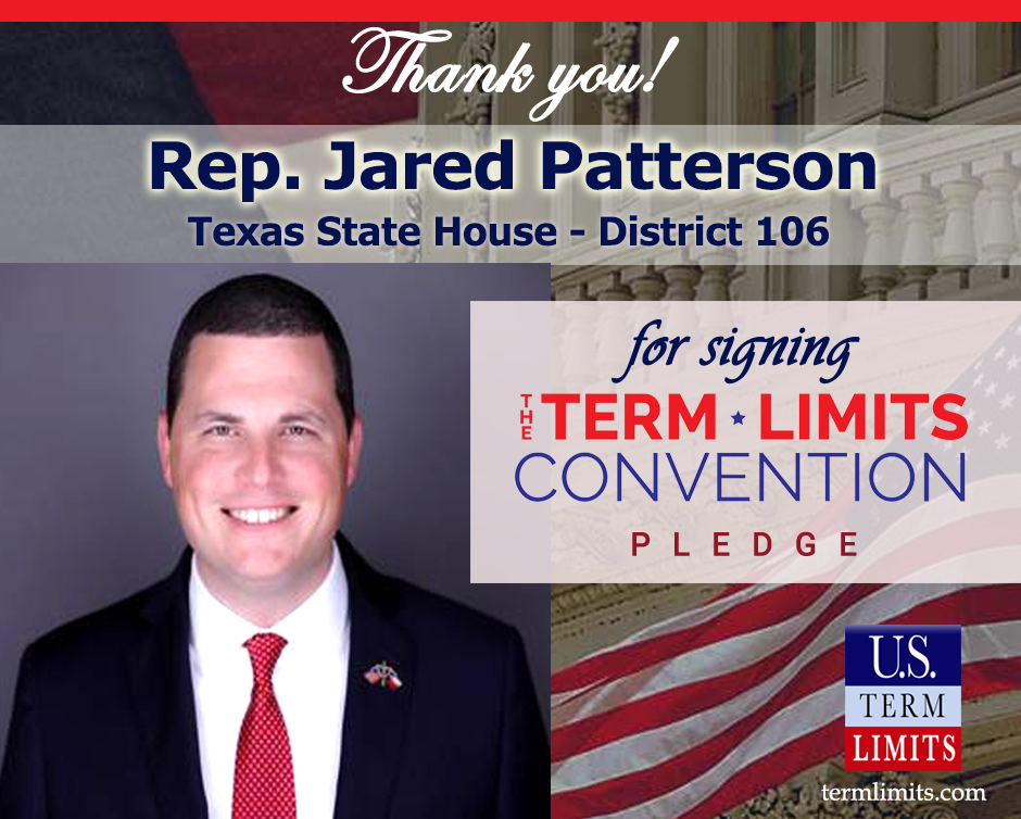 Washington, D.C. – U.S. Term Limits (USTL), the leader in the national, non-partisan movement to limit terms for elected officials, is gathering support from state lawmakers across the nation. Its mission is to get 34 states to apply for an amendment proposal convention specific to term limits on Congress. 2020 Texas State Rep. Jared Patterson (district 106), has committed support for term limits on Congress by signing the Term Limits Convention pledge.