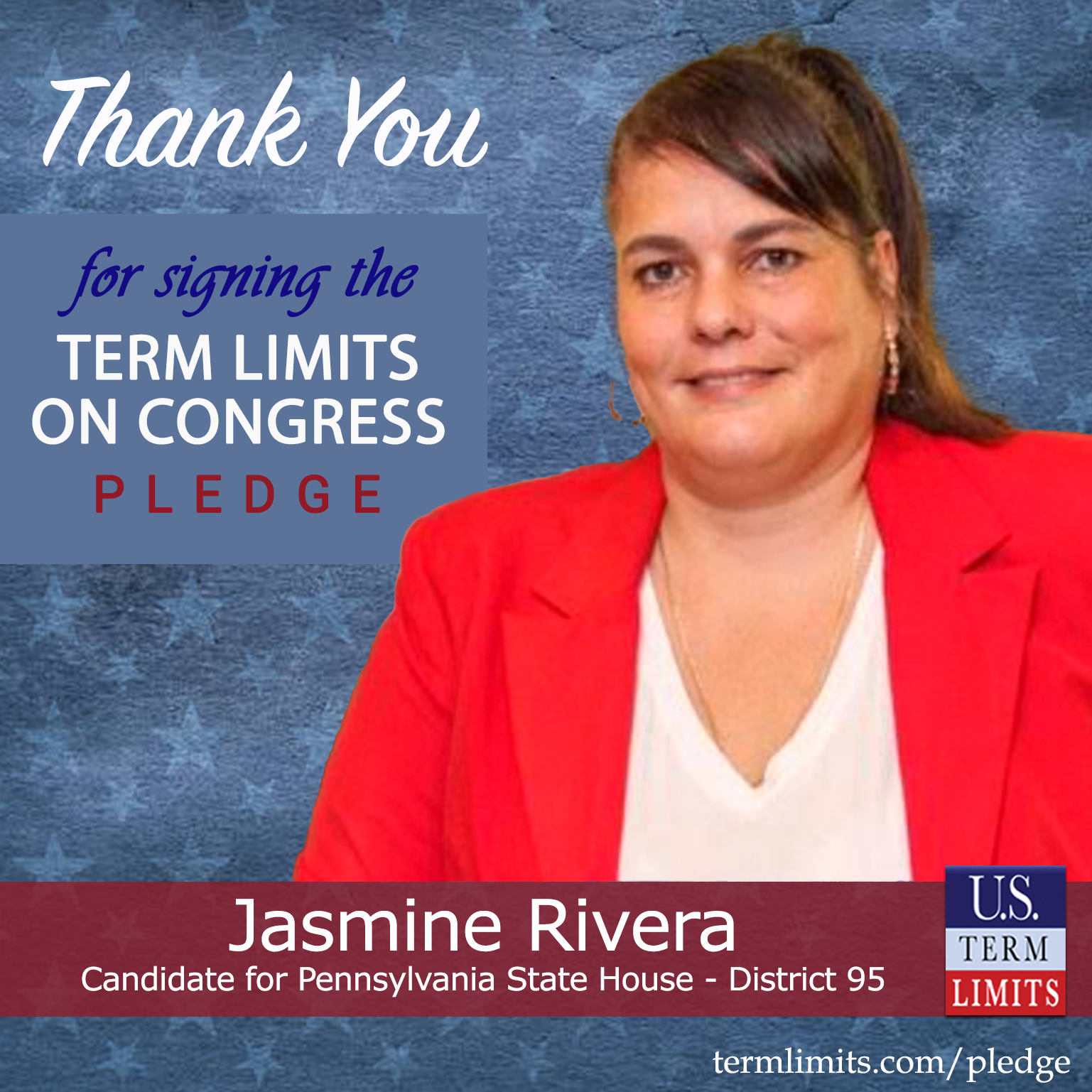 York, PA– U.S. Term Limits (USTL), the leader in the national, non-partisan movement to limit terms for elected officials, is gathering support from state lawmakers across the nation. Its mission is to get 34 states to apply for an amendment proposal convention specific to term limits on Congress. Pennsylvania state house candidate, Jasmine Rivera (district 95), has committed support for term limits on Congress by signing the term limits convention pledge.