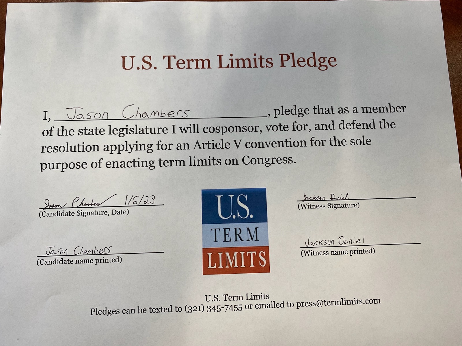 Raleigh, NC – U.S. Term Limits (USTL), the leader in the national, non-partisan movement to limit terms for elected officials, is gathering support from state lawmakers across the nation. Its mission is to get 34 states to apply for an amendment proposal convention specific to term limits on Congress. North Carolina state house candidate, Jason Chambers (District 2), has committed support for term limits on Congress by signing the term limits convention pledge. Chambers is the first signer in this race.