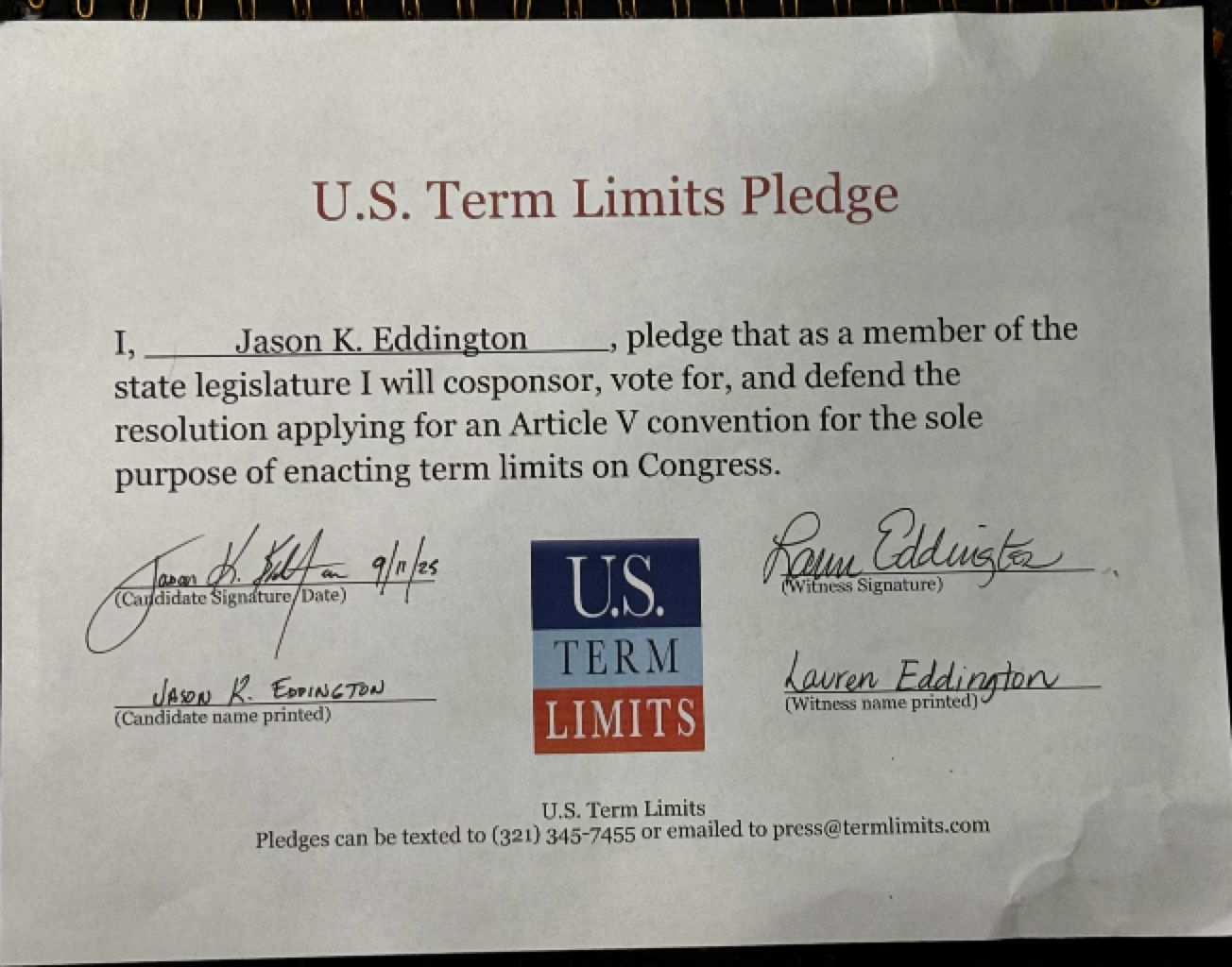Houston, TX – U.S. Term Limits (USTL), the leader in the national, non-partisan movement to limit terms for elected officials, is gathering support from state lawmakers across the nation. Its mission is to get 34 states to apply for an amendment proposal convention specific to term limits on Congress. 2026 Texas state senate candidate, Jason Eddington (district 6), has committed support for term limits on Congress by signing the term limits convention pledge.