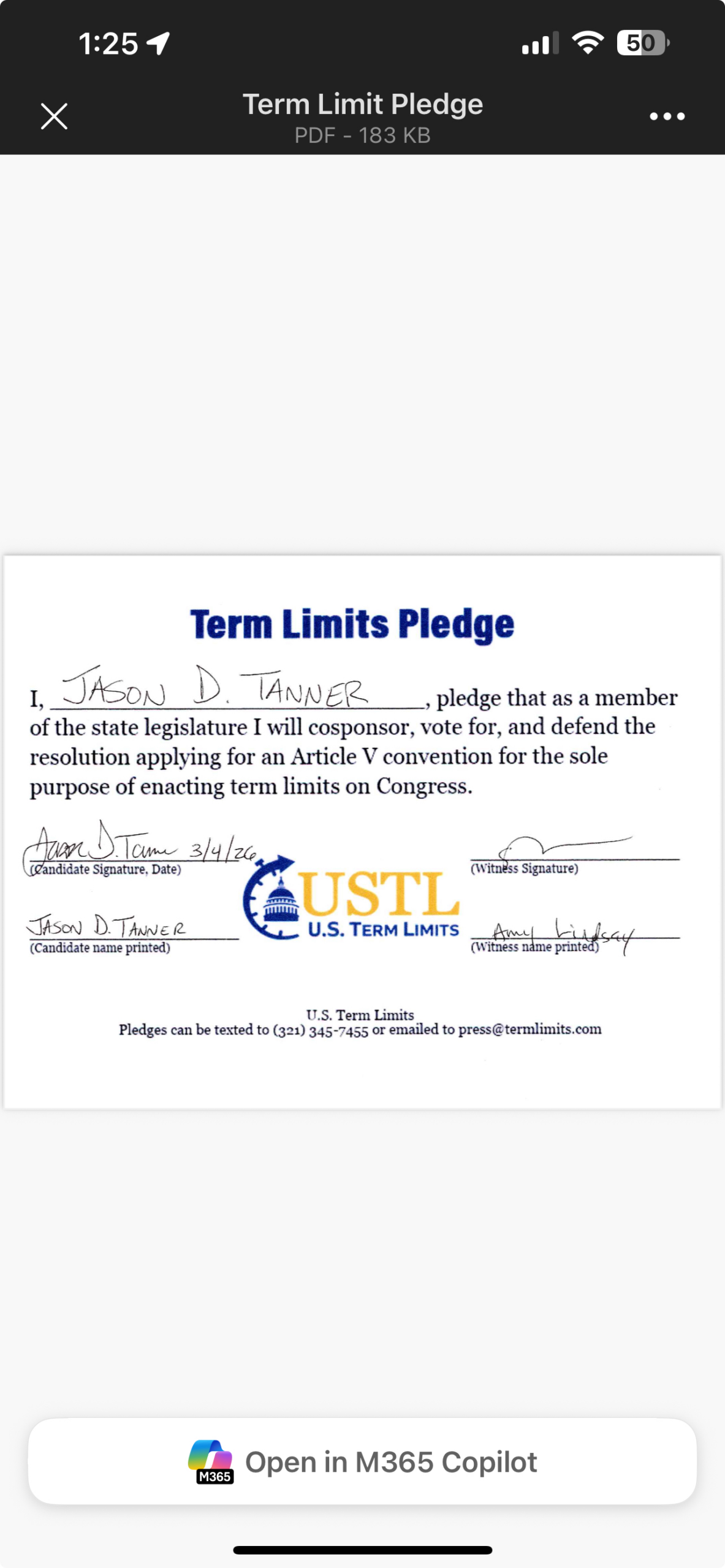 Woodstock, GA – U.S. Term Limits (USTL), the leader in the national, non-partisan movement to limit terms for elected officials, is gathering support from state lawmakers across the nation. Its mission is to get 34 states to apply for an amendment proposal convention specific to term limits on Congress. 2026 Georgia state house candidate, Jason Tanner (district 20), has committed support for term limits on Congress by signing the term limits convention pledge. Rep. Charlice Byrd also signed.