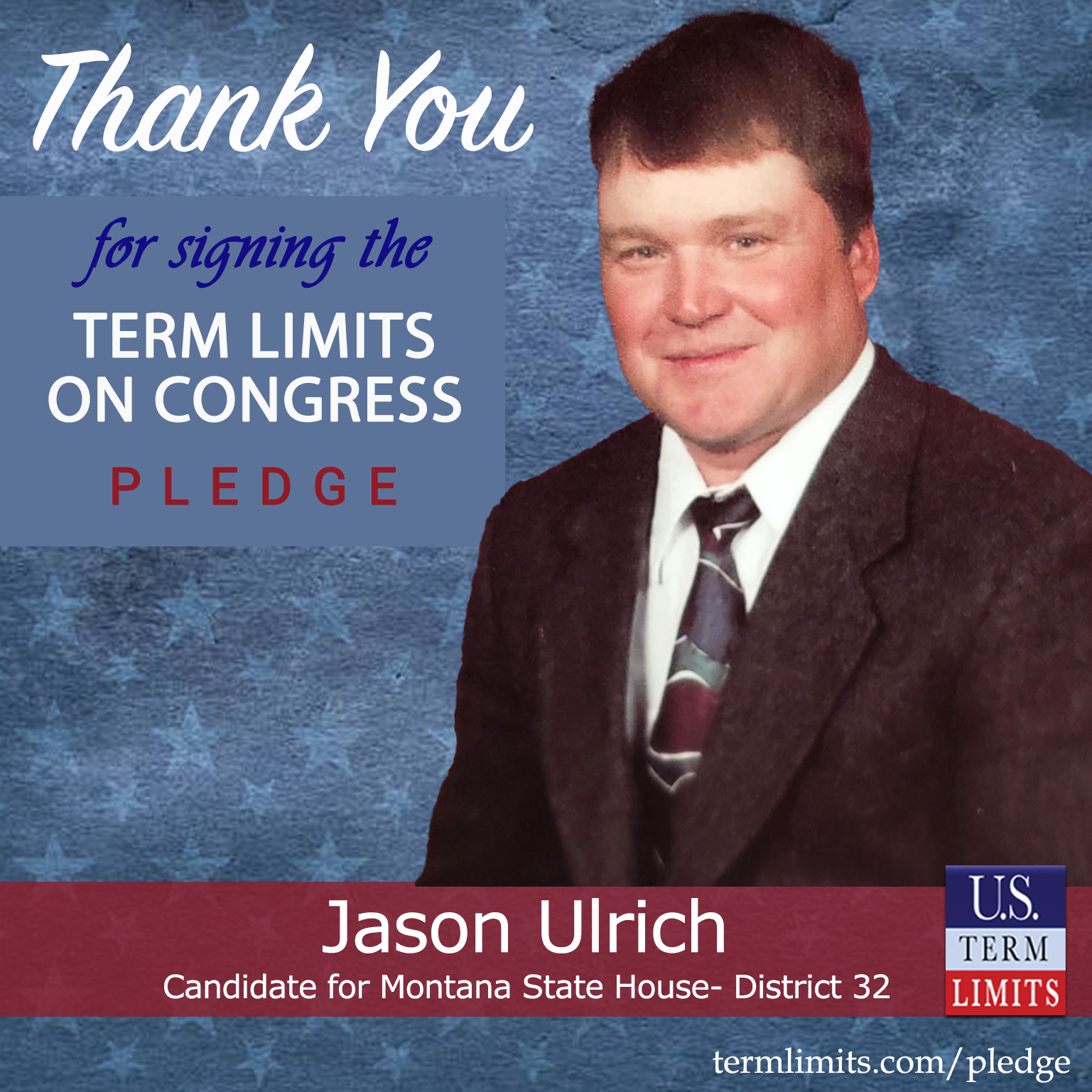 State Chair for U.S. Term Limits, Ed Walker, commented on Ulrich’s pledge saying, “Term limits is critical for the future of our country. I am glad Jason has signed the pledge in supporting term limits on Congress. It shows that he understands the importance of the vision of our founding fathers and fixing DC. “