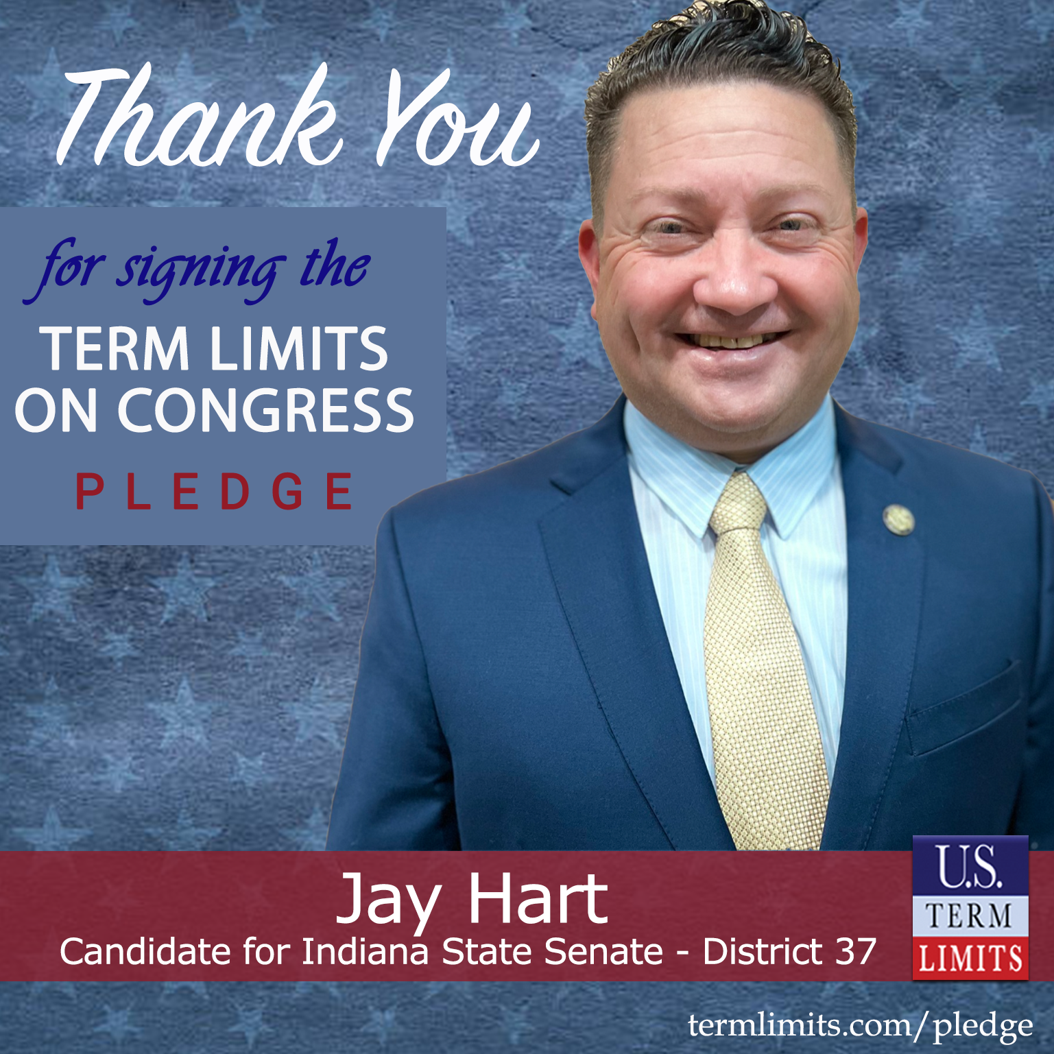 Martinsville, IN – U.S. Term Limits (USTL), the leader in the national, non-partisan movement to limit terms for elected officials, is gathering support from state lawmakers across the nation. Its mission is to get 34 states to apply for an amendment proposal convention specific to term limits on Congress. Indiana state senate candidate, Jay Hart (District 37), has committed support for term limits on Congress by signing the term limits convention pledge. Hart is the first signer in this race.