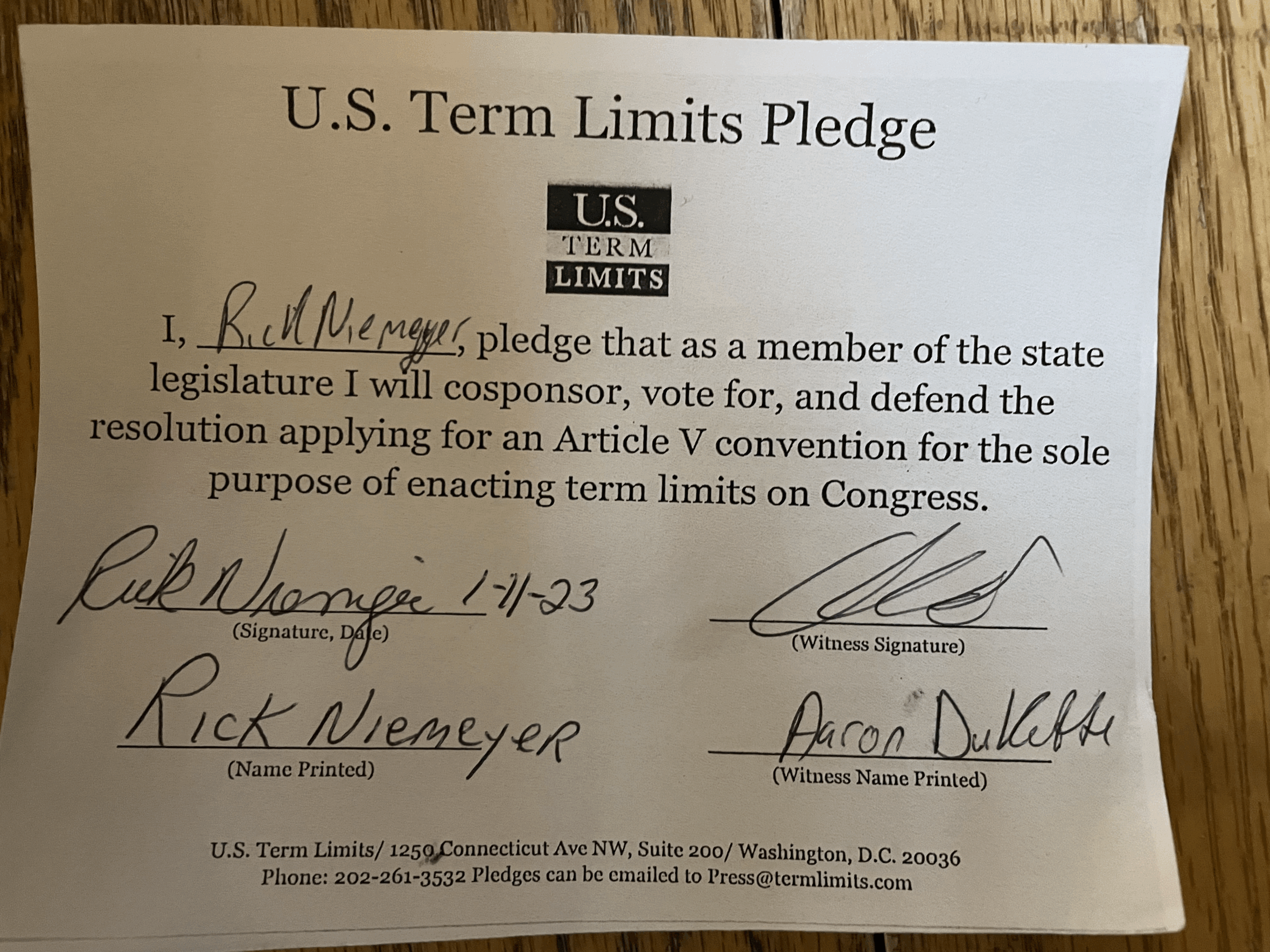 The U.S. Term Limits pledge is provided to candidates and members of state legislatures. It reads, “I pledge that, as a member of the state legislature, I will cosponsor, vote for, and defend the resolution applying for an Article V convention for the sole purpose of enacting term limits on Congress.”
