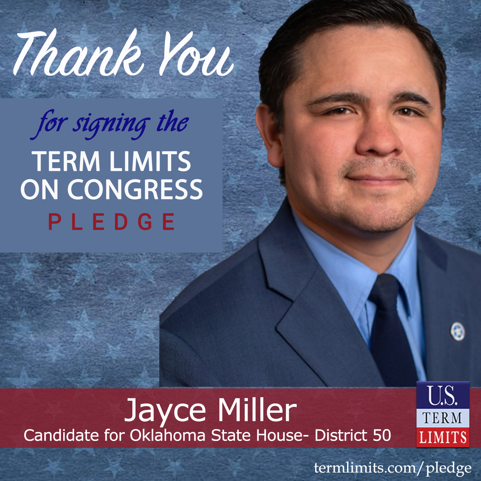 Comanche, OK– U.S. Term Limits (USTL), the leader in the national, non-partisan movement to limit terms for elected officials, is gathering support from state lawmakers across the nation. Its mission is to get 34 states to apply for an amendment proposal convention specific to term limits on Congress. Oklahoma state house candidate, Jayce Miller (District 50), has committed support for term limits on Congress by signing the term limits convention pledge. Previously, candidate Stacy Jo Adams also signed the pledge.