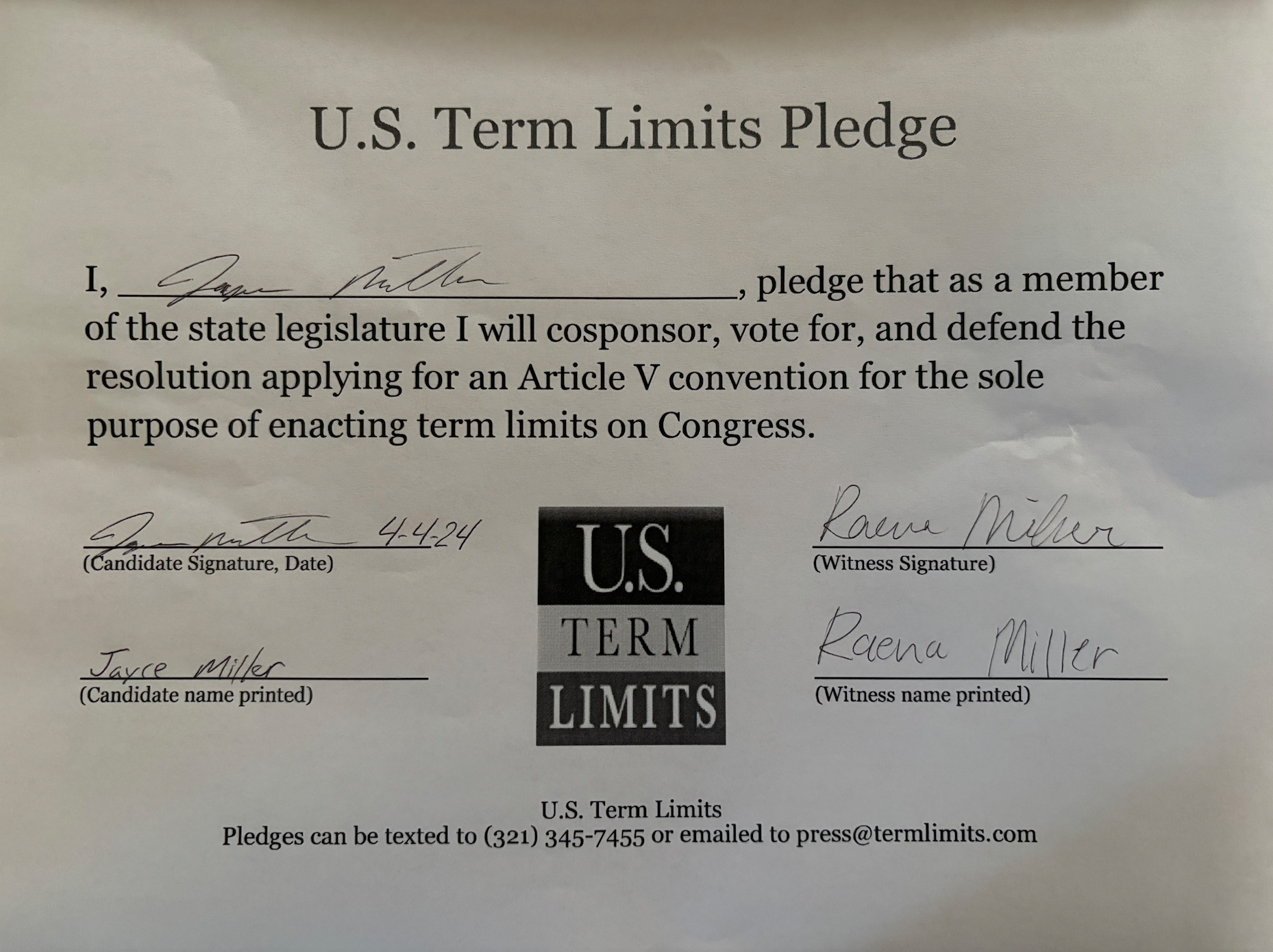 USTL President, Philip Blumel, commented on Miller’s and Adams’s pledges saying, “Jayce’s and Stacy Jo’s strong support of term limits shows that there are individuals who are willing to listen to the majority of voters who want term limits. America needs a Congress that will be served by citizen legislators, not career politicians.”