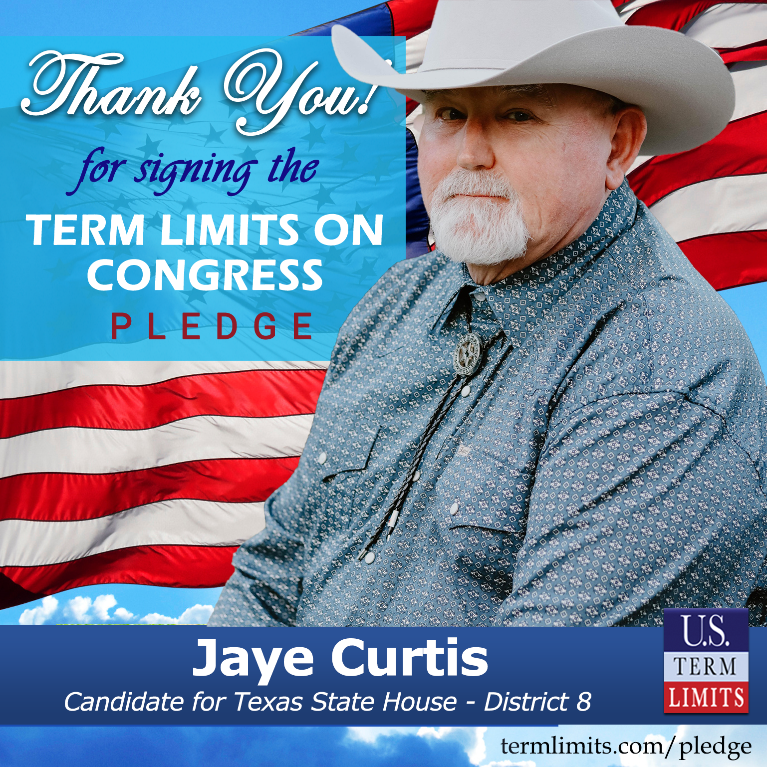 USTL President, Philip Blumel, commented on Curtis’s pledge saying, “Jaye’s strong support of term limits shows that there are individuals who are willing to listen to the majority of voters who want term limits. America needs a Congress that will be served by citizen legislators, not career politicians.”