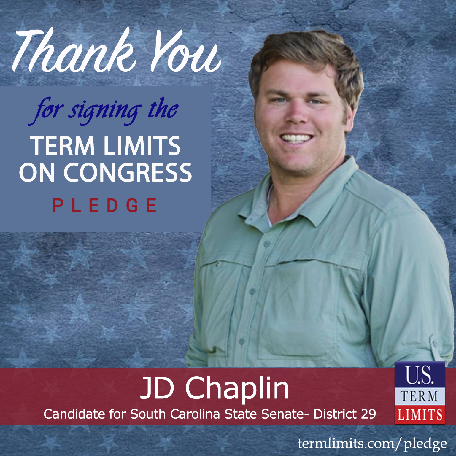 Hartsville, SC – U.S. Term Limits (USTL), the leader in the national, non-partisan movement to limit terms for elected officials, is gathering support from state lawmakers across the nation. Its mission is to get 34 states to apply for an amendment proposal convention specific to term limits on Congress. South Carolina state senate candidate, JD Chaplin (District 29), has committed support for term limits on Congress by signing the Term Limits Convention Pledge.
