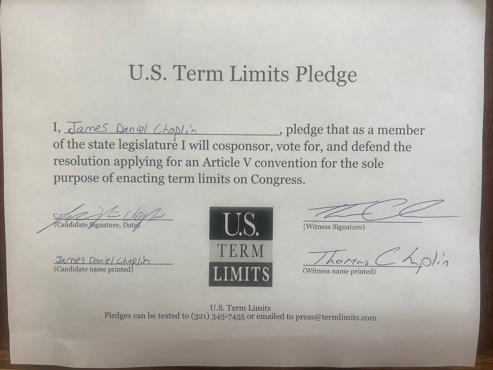 USTL President, Philip Blumel, commented on Chaplin’s pledge saying, “JD’s strong support of term limits shows that there are individuals who are willing to listen to the majority of voters who want term limits. America needs a Congress that will be served by citizen legislators, not career politicians.”