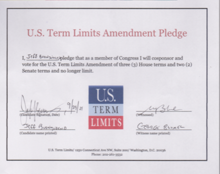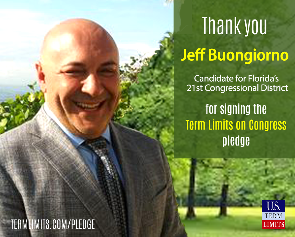Washington D.C. – U.S. Term Limits (USTL), the leader in the non-partisan national movement to limit terms for elected officials, praises 2022 U.S. house candidate for Florida, Jeff Buongiorno (district 21), for signing the pledge for an amendment to term limit Congress. Previously, candidates Rod Dorilas and Dan Franzese also signed the pledge.