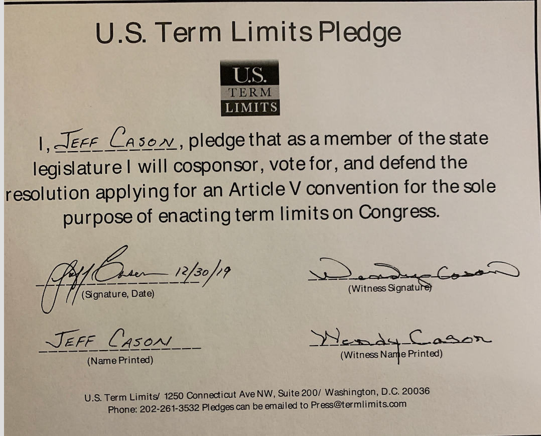 Washington, D.C. – U.S. Term Limits (USTL), the leader in the national, non-partisan movement to limit terms for elected officials, is gathering support from state lawmakers across the nation. Its mission is to get 34 states to apply for an amendment proposal convention specific to term limits on Congress. 2020 Texas state house candidate, Jeff Cason, (district 92), has committed support for term limits on Congress by signing the Term Limits Convention pledge. The primary election is scheduled for March 3, 2020.