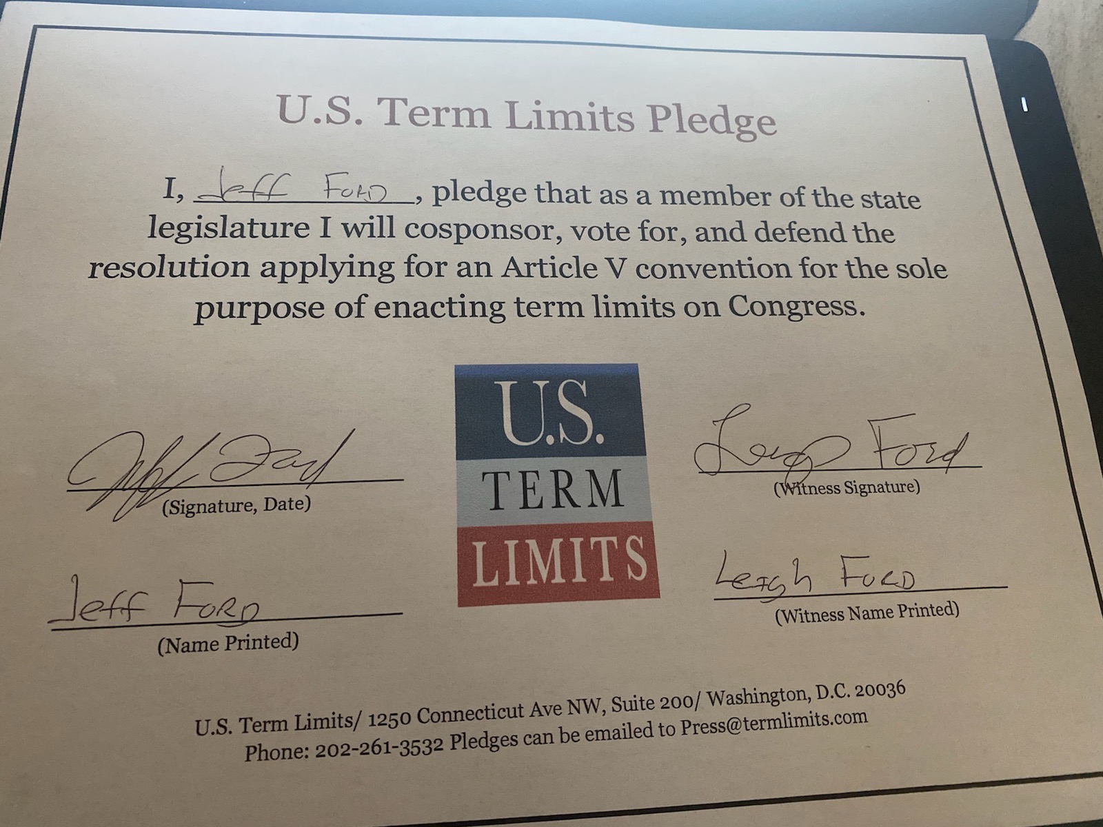 Jeff Ford Pledges to Support Congressional Term Limits