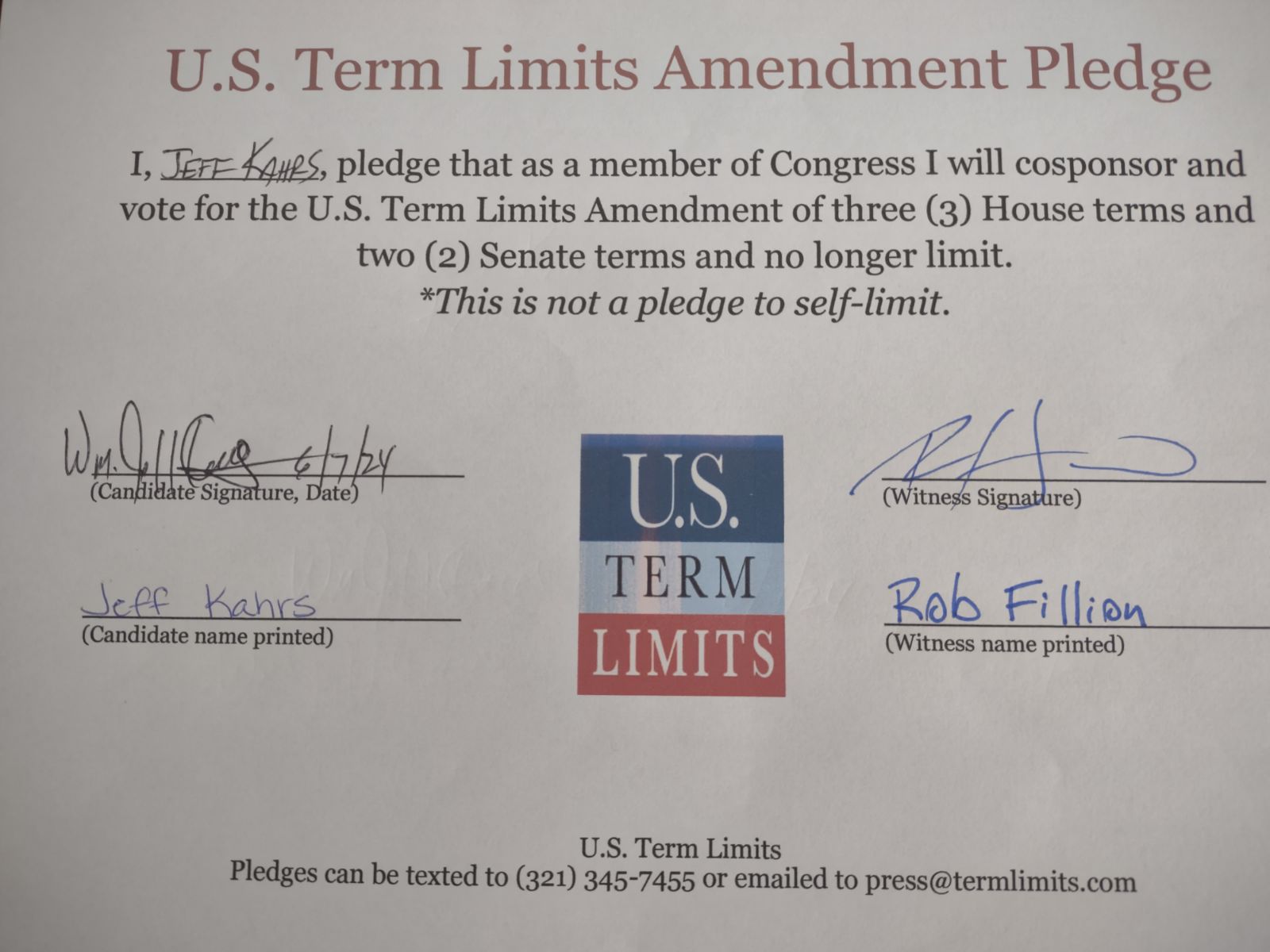 Jeff Kahrs Pledges to Support Term Limits on Congress
