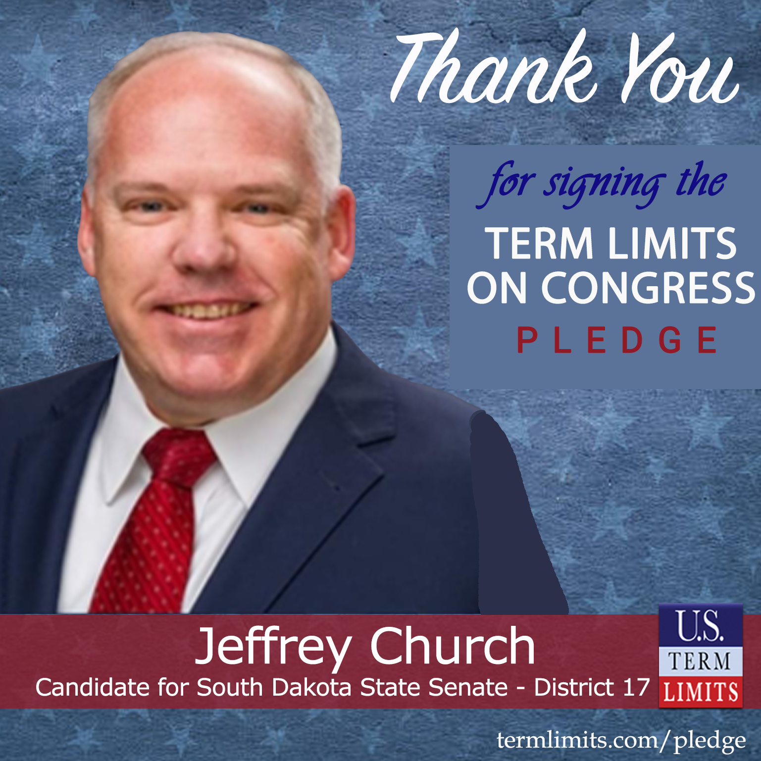 Burbank, SD – U.S. Term Limits (USTL), the leader in the national, non-partisan movement to limit terms for elected officials, is gathering support from state lawmakers across the nation. Its mission is to get 34 states to apply for an amendment proposal convention specific to term limits on Congress. South Dakota state senate candidate, Jeffrey Church (district 17), has committed support for term limits on Congress by signing the term limits convention pledge. Church is the first signer in this race.
