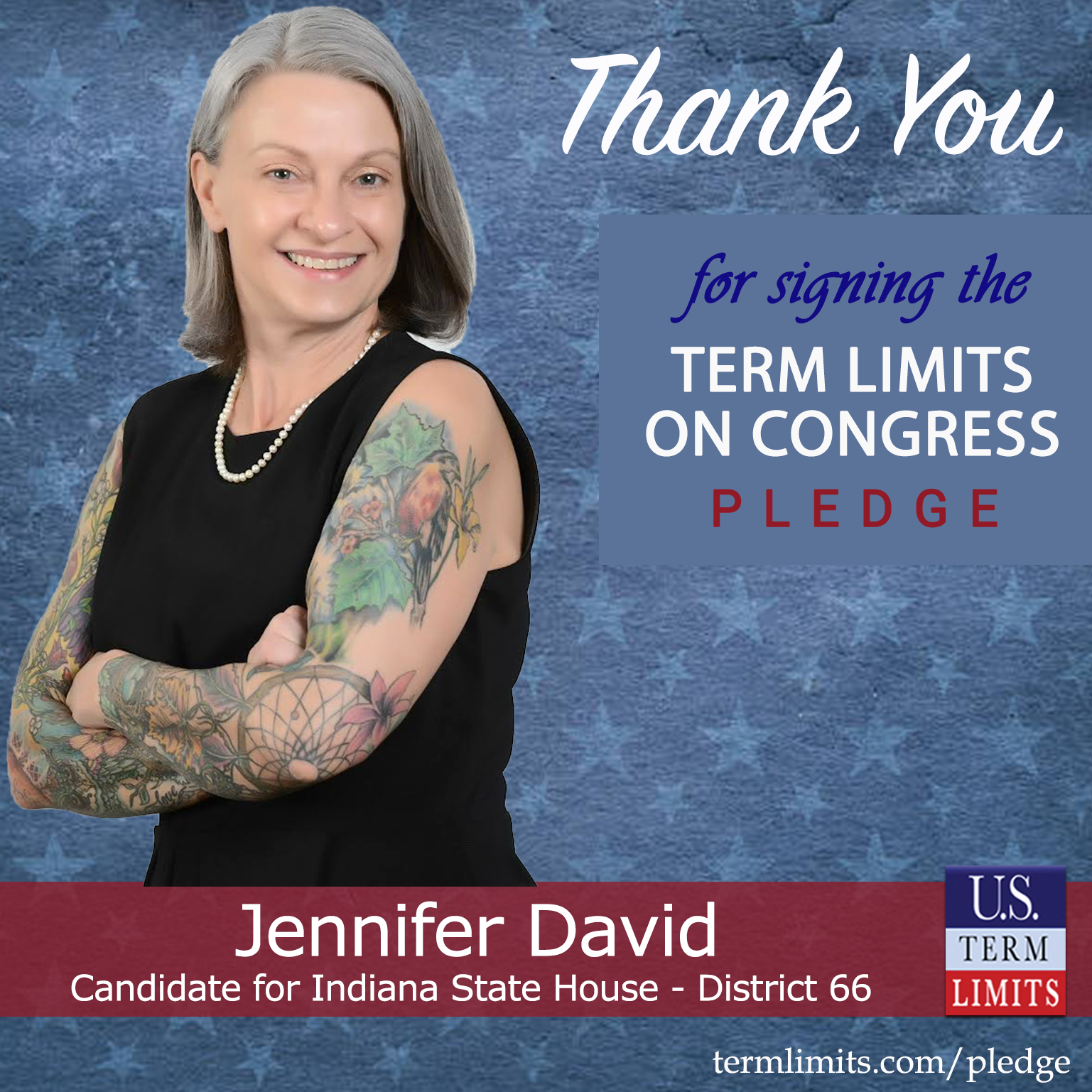 Charlestown, IN – U.S. Term Limits (USTL), the leader in the national, non-partisan movement to limit terms for elected officials, is gathering support from state lawmakers across the nation. Its mission is to get 34 states to apply for an amendment proposal convention specific to term limits on Congress. Indiana state house candidate, Jennifer David (District 66), has committed support for term limits on Congress by signing the term limits convention pledge. Previously, incumbent Rep. Zach Payne and candidates Jim Baker and Rick Cannon also signed the pledge.