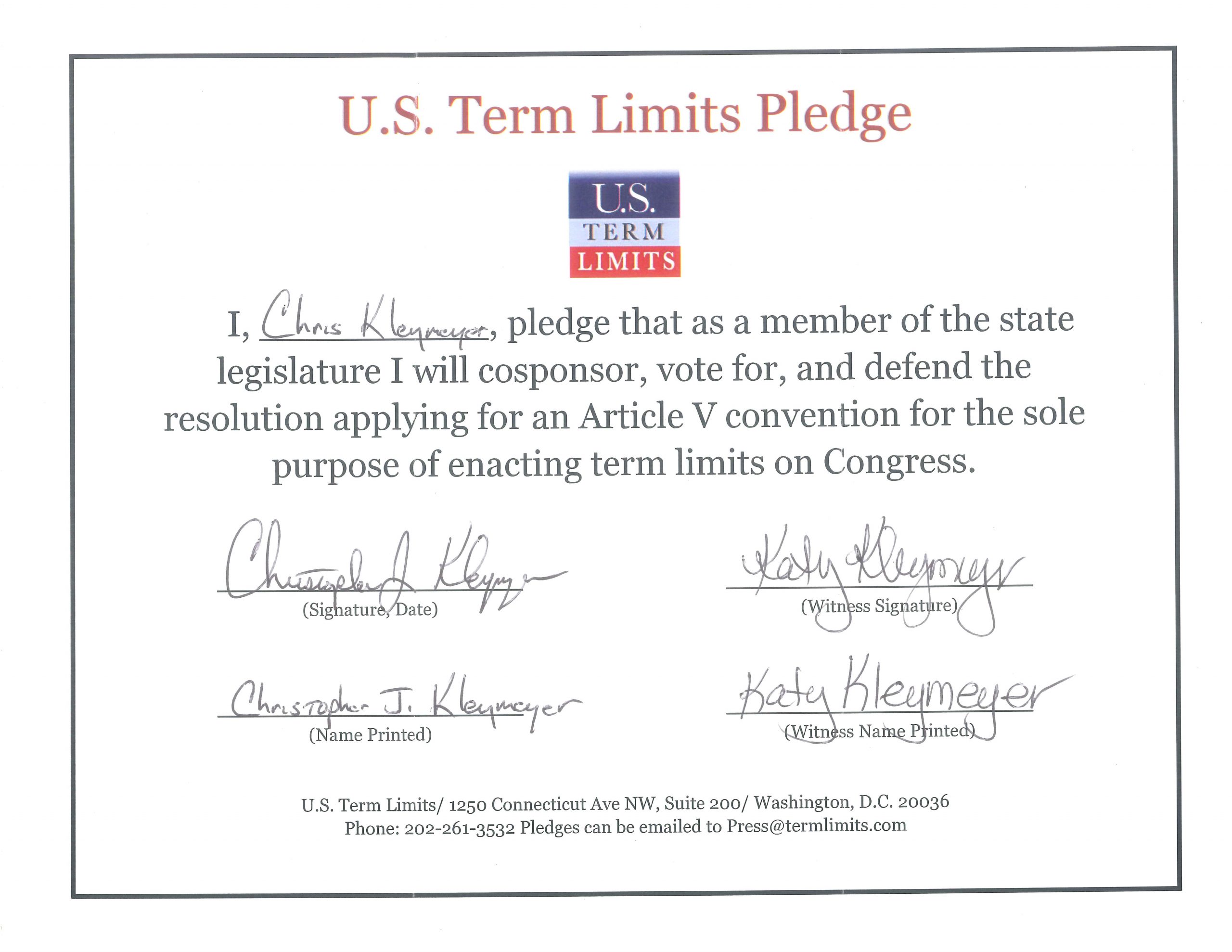 The U.S. Term Limits pledge is provided to candidates and members of state legislatures. It reads, “I pledge that, as a member of the state legislature, I will cosponsor, vote for, and defend the resolution applying for an Article V convention for the limited purpose of enacting term limits on Congress.”