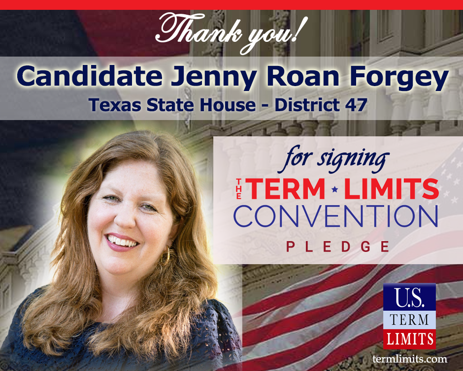 Washington, D.C. – U.S. Term Limits (USTL), the leader in the national, non-partisan movement to limit terms for elected officials, is gathering support from state lawmakers across the nation. Its mission is to get 34 states to apply for an amendment proposal convention specific to term limits on Congress. Texas state house candidate, Jenny Roan Forgey (district 47) has committed support for term limits on Congress by signing the Term Limits Convention pledge. Previously, candidates Aaron Reitz and Jennifer Fleck also signed the pledge. The primary election is scheduled for March 3, 2020.