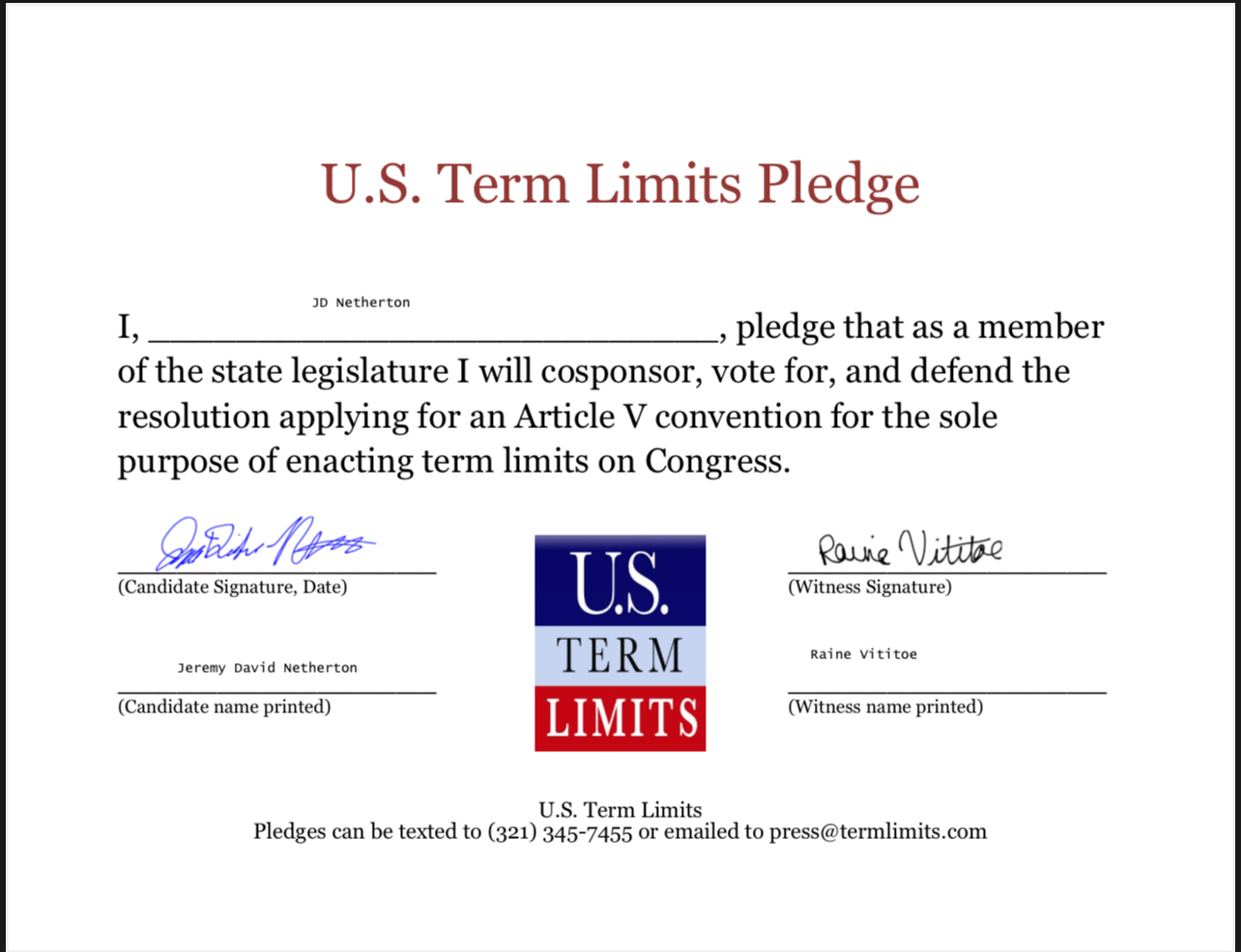 J.D. Netherton Pledges to Support Congressional Term Limits