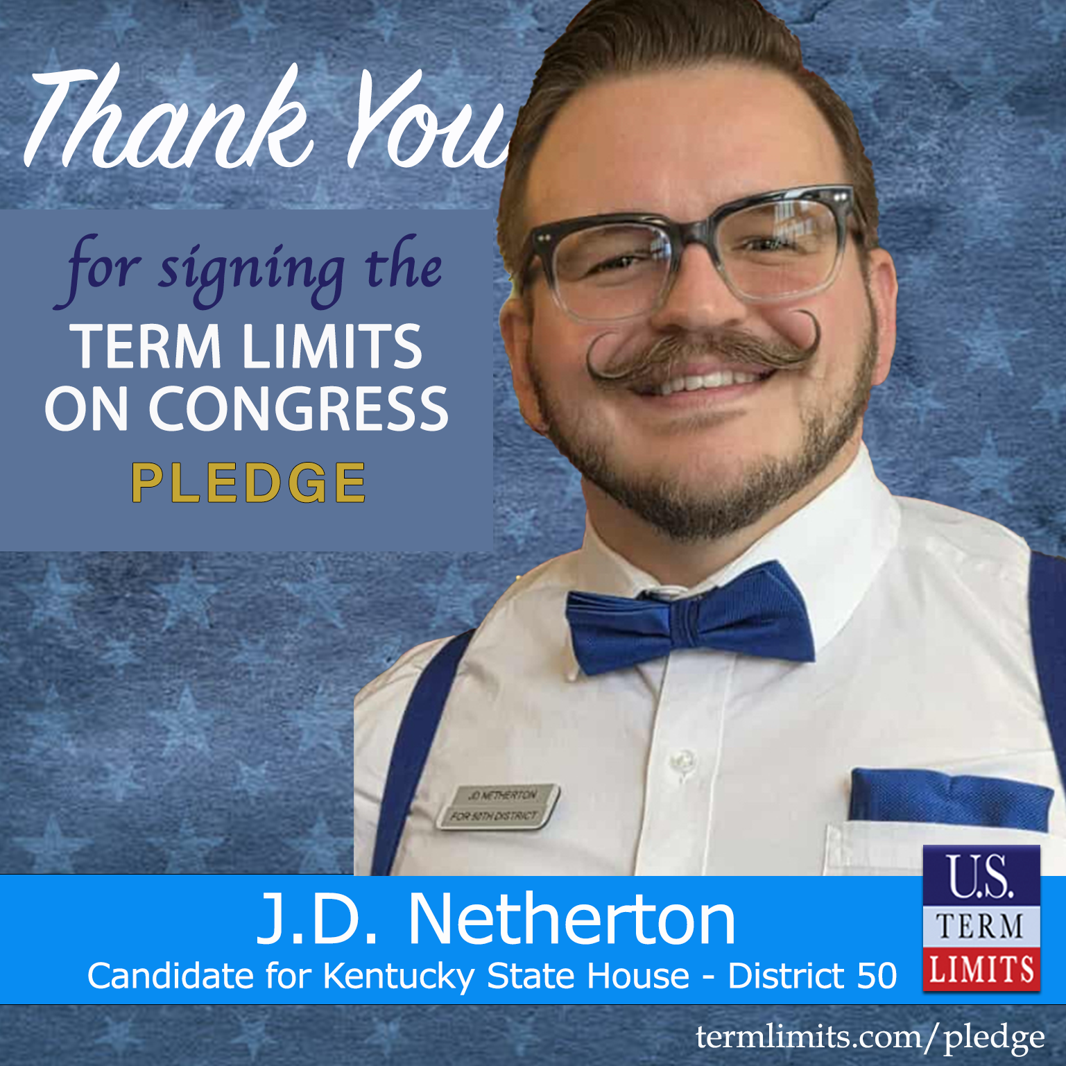 Bardstown, KY – U.S. Term Limits (USTL), the leader in the national, non-partisan movement to limit terms for elected officials, is gathering support from state lawmakers across the nation. Its mission is to get 34 states to apply for an amendment proposal convention specific to term limits on Congress. 2026 Kentucky state house candidate, J.D. Netherton (district 50), has committed support for term limits on Congress by signing the term limits convention pledge. Previously, incumbent Rep. Candy Massaroni also signed the pledge.