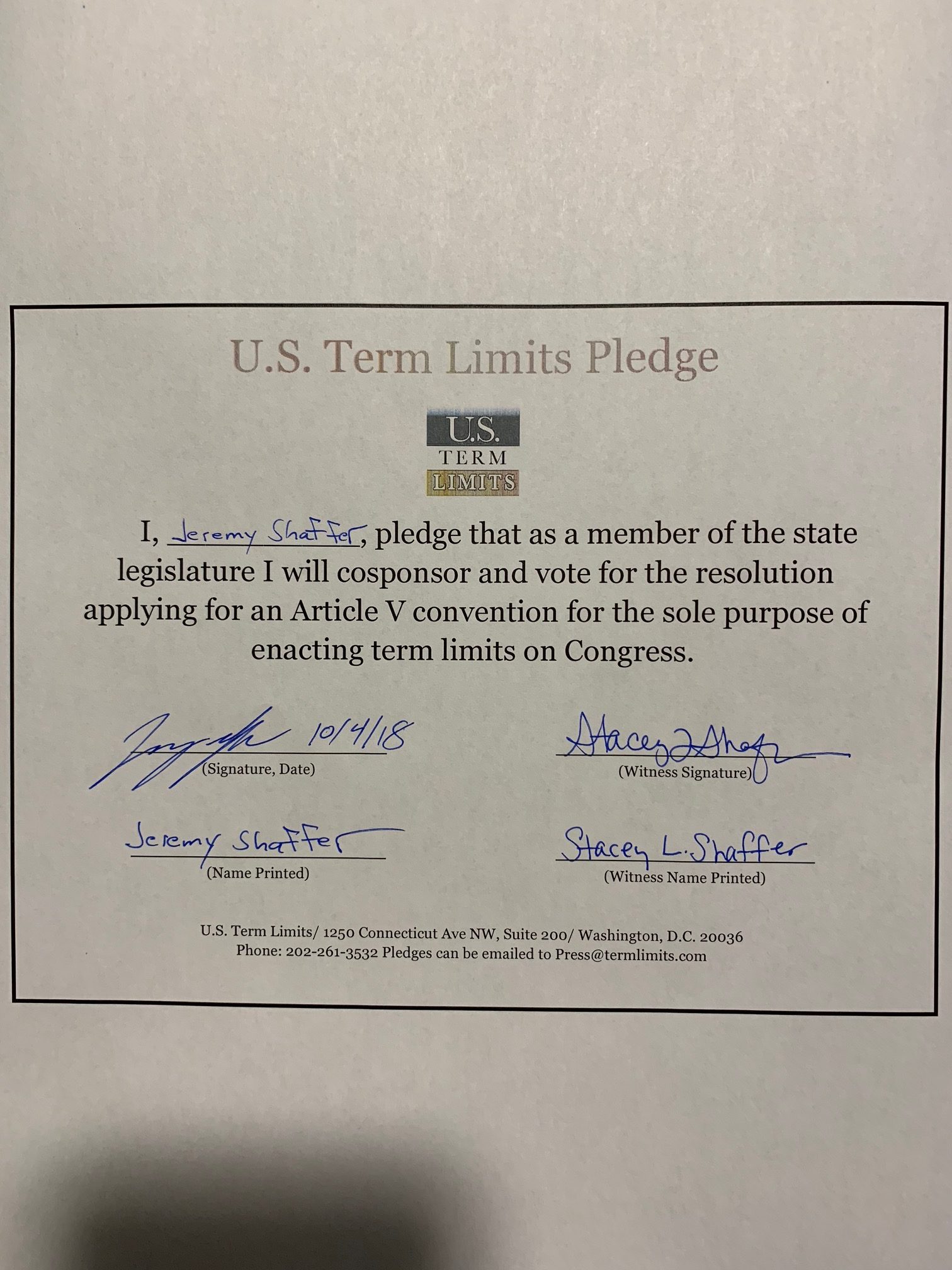 Washington, D.C. – U.S. Term Limits (USTL), the leader in the national, non-partisan movement to limit terms for elected officials, is gathering support from state lawmakers across the nation. Its mission is to get 34 states to apply for an amendment proposal convention specific to term limits on Congress. Pennsylvania senate candidate Jeremy Shaffer, district 38, is the first candidate in this race to support term limits on Congress by signing the Term Limits Convention pledge.