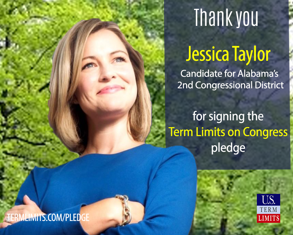 Washington, DC – U.S. Term Limits (USTL), the leader in the non-partisan national movement to limit terms for elected officials, praises Jessica Taylor, 2020 U.S. House candidate for Alabama (district 2), for signing the pledge for an amendment to term limit Congress. Previously, candidates Troy King and Barry Moore also signed the pledge. These candidates are in the race for the Congressional seat U.S. Rep. Martha Roby will leave after next year. The primary election is scheduled for March 3, 2020.