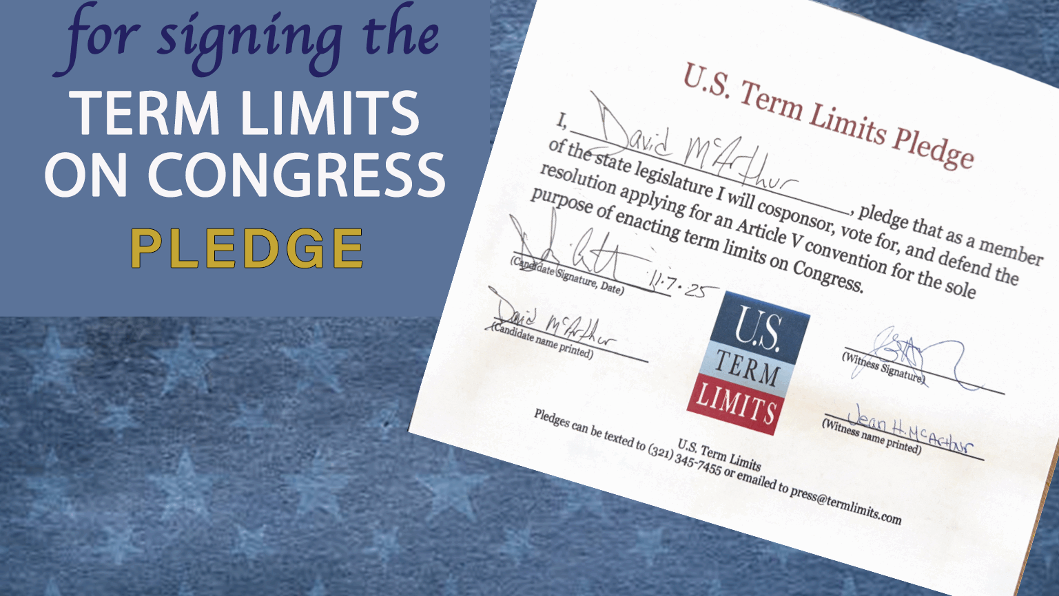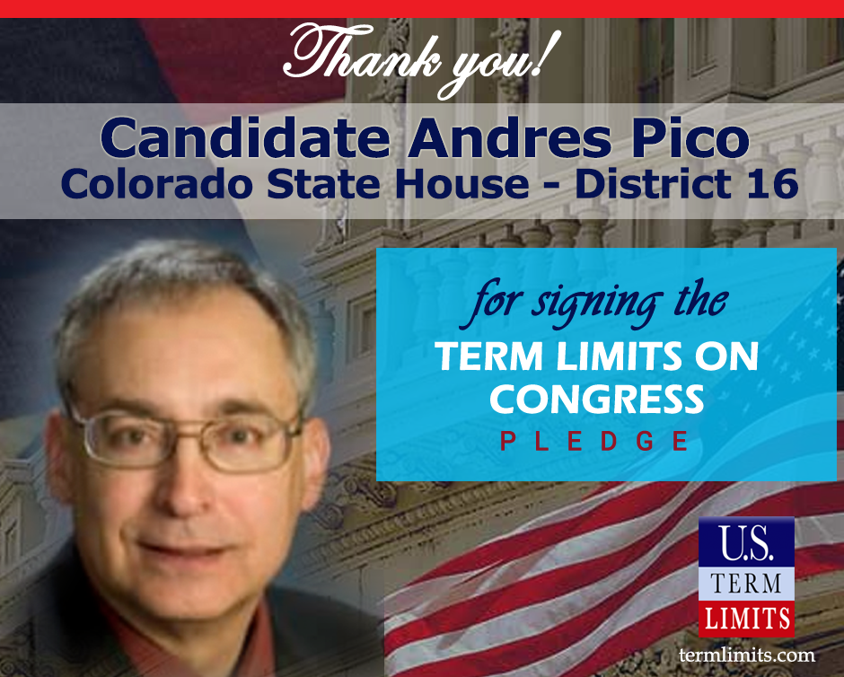 The U.S. Term Limits pledge is provided to candidates and members of state legislatures. It reads, “I pledge that, as a member of the state legislature, I will cosponsor, vote for, and defend the resolution applying for an Article V convention for the limited purpose of enacting term limits on Congress.”