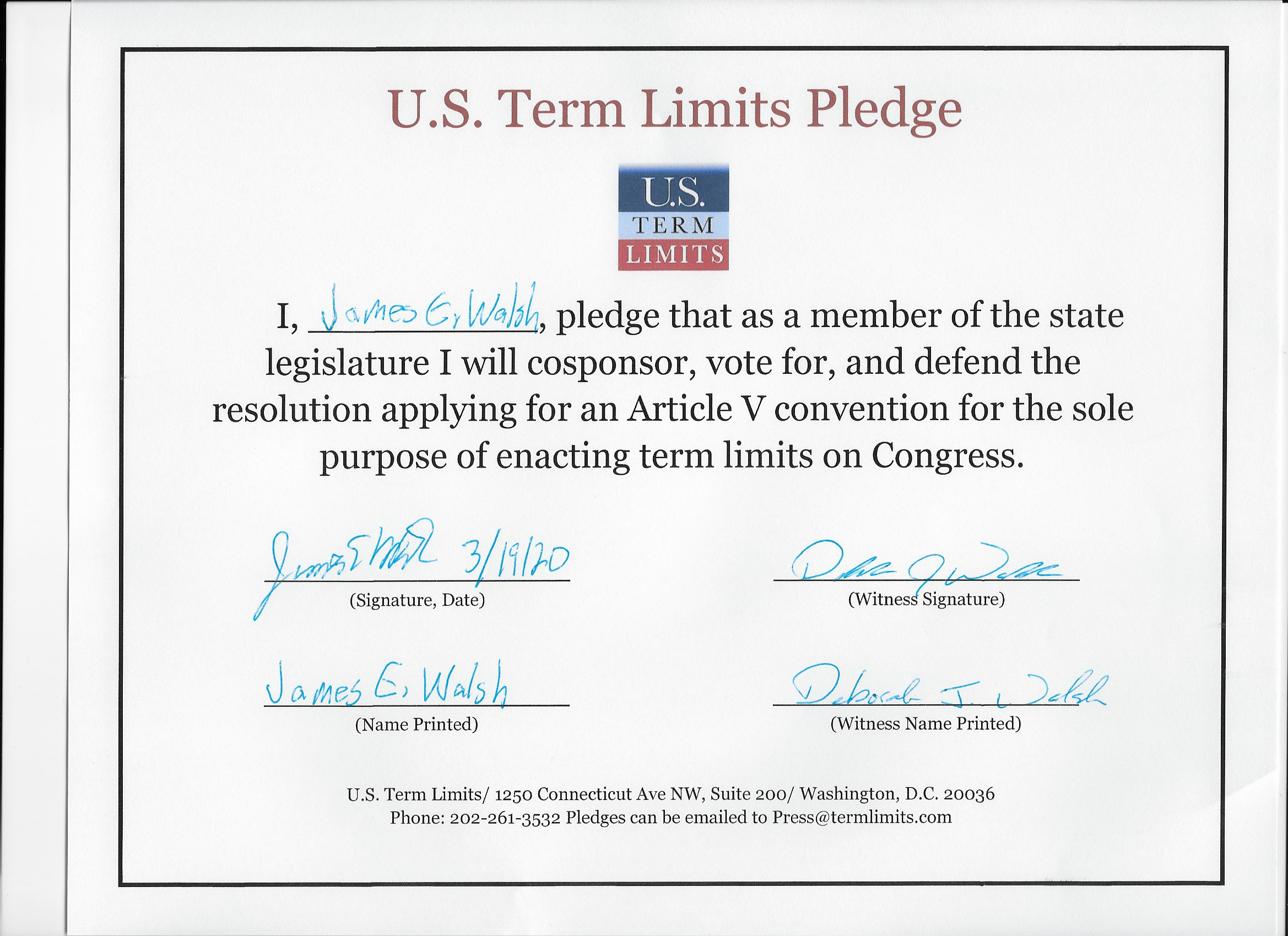 USTL President, Philip Blumel, commented on Walsh’s pledge saying, “Jim’s support of term limits shows that there are individuals who are willing to listen to the majority of voters who want term limits. America needs a Congress that will be served by citizen legislators, not career politicians.”